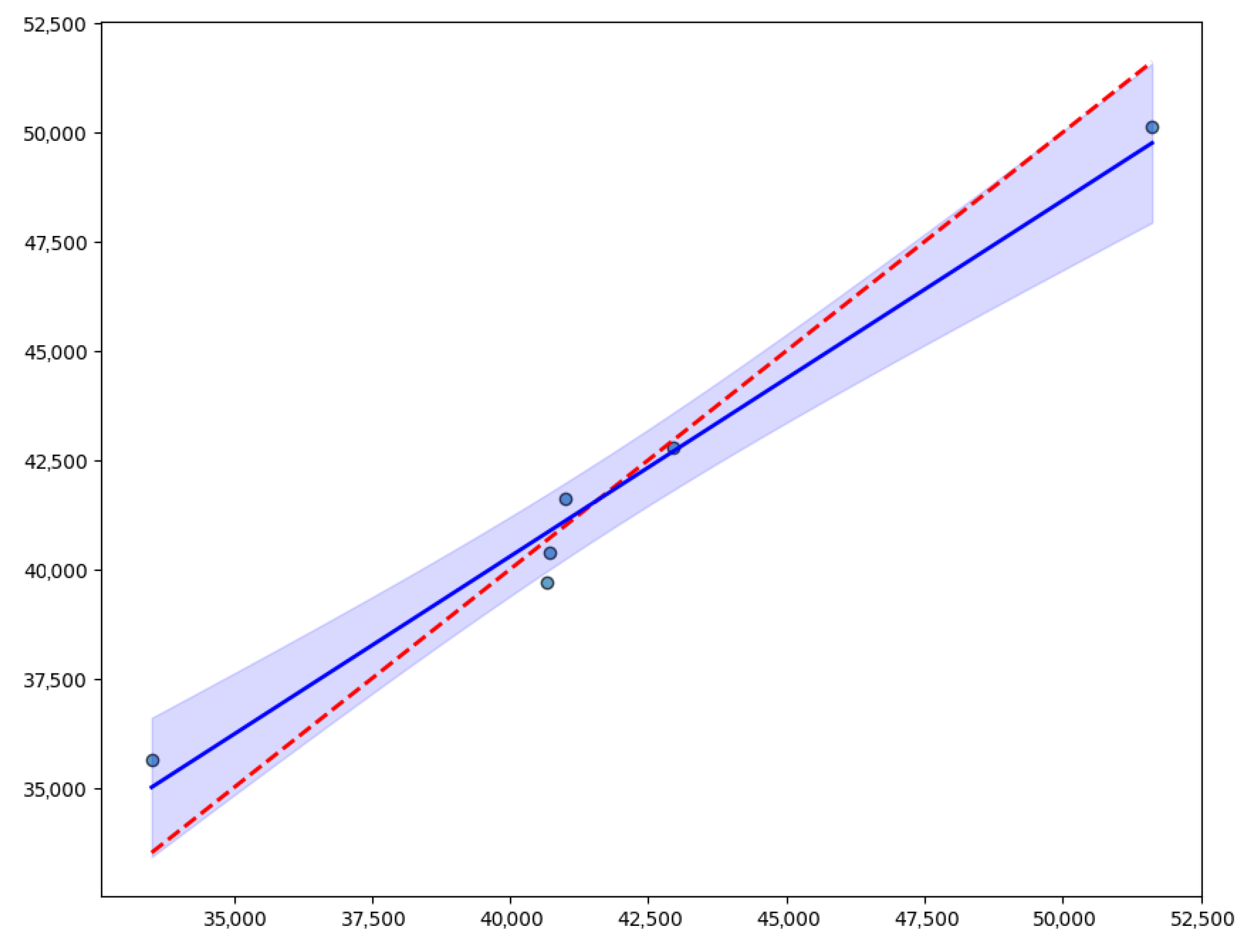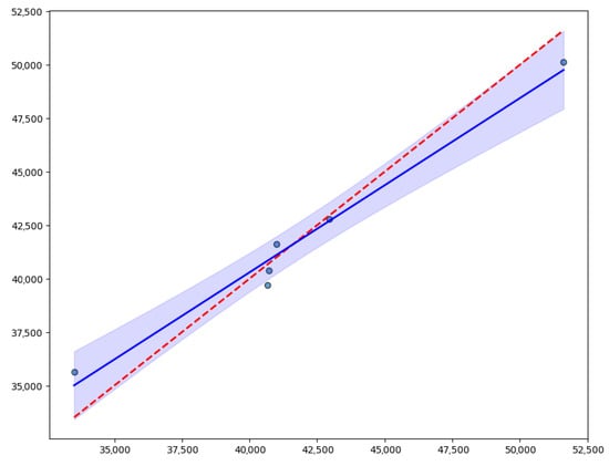 The relationship between observed and predicted yield by the RF model on the test set is presented. The inset reports the fit metrics, which are a high coefficient of determination (R2 = 0.95) and an RMSE of 1164.9 kg ha−1; the identity line (red dashed) represents the perfect prediction situation; while the best fit line (blue) was obtained by regression between observed and predicted values. Its estimated slope is 0.81, with a 95% confidence interval (0.65–0.98), and the intercept is 7709, with a confidence interval (880–14,538) kg ha−1. The shaded band around the fit line indicates the 95% confidence interval, reflecting uncertainty in the estimated trend. Additionally, it indicates that 92% of points are within ±2124 kg ha−1 of the prediction, giving an idea of individual error dispersion with respect to the fitted line (Figure 6). Data points cluster reasonably close to the diagonal, with some evident deviations at the extremes of the yield range.