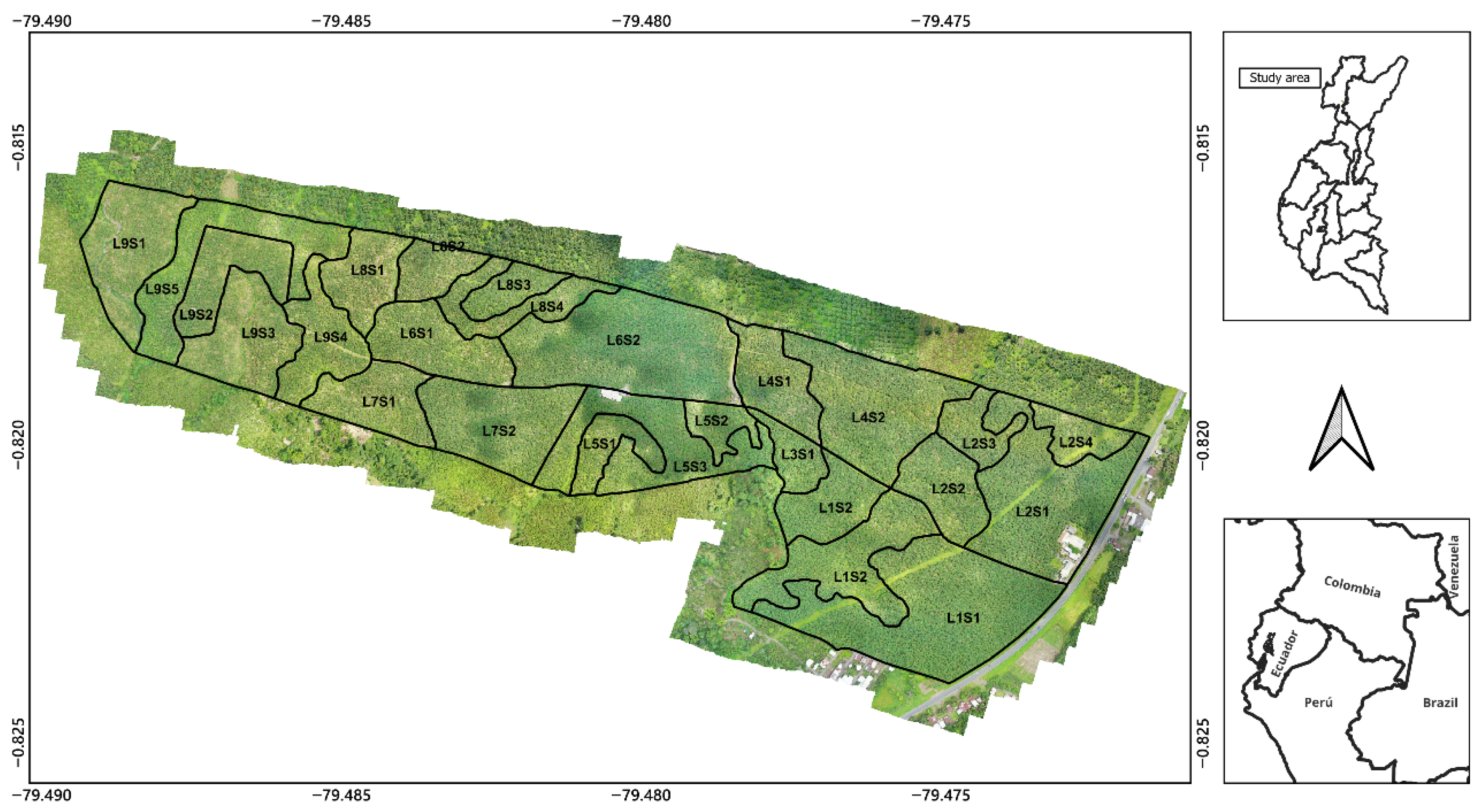 Orthophotomosaic of the study farm, with delimitation of banana yield plots (L1S1–L9S5). The insets show the geographic location of the site within Los Ríos province–Ecuador–South America.