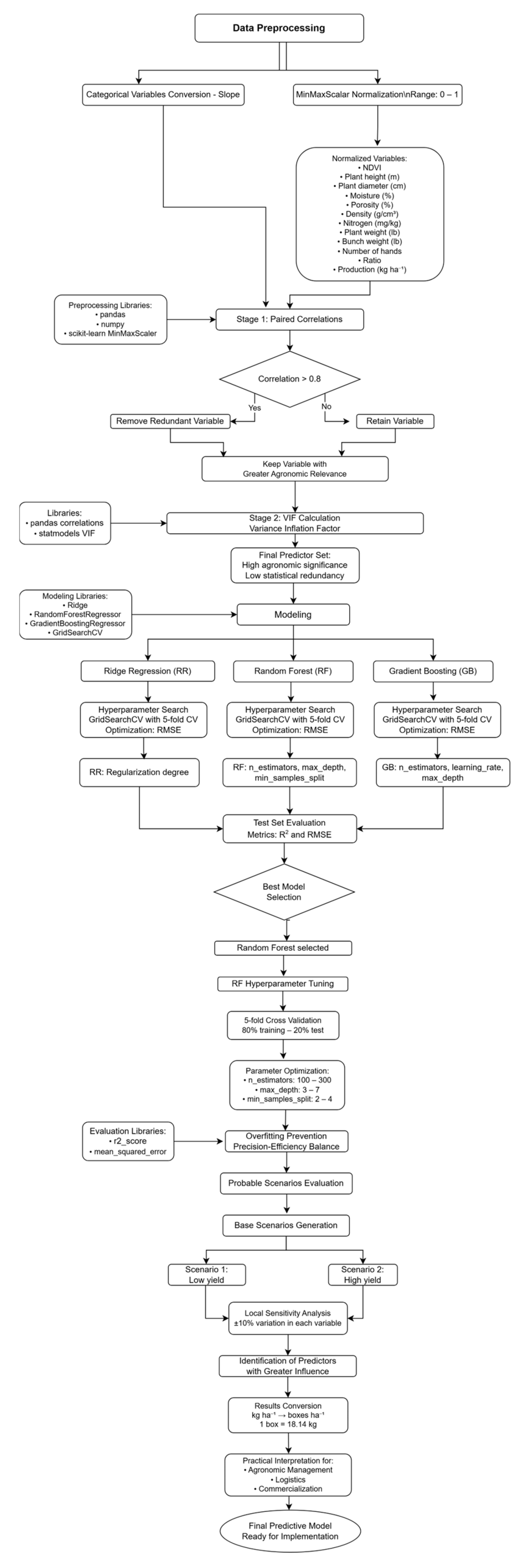 For the predictive model, three algorithms were employed: Ridge Regression (RR), Random Forest (RF), and Gradient Boosting (GB), with the objective of estimating banana yield. For each algorithm, a systematic hyperparameter search was performed through 5-fold cross-validation (GridSearchCV) [42], directly optimizing the RMSE (Root Mean Squared Error) metric through the negative scoring function (neg_root_mean_squared_error) [43,44] to guarantee selection of configurations with a lower prediction error. For model fitting, a systematic hyperparameter search with 5-fold cross-validation was employed, directly optimizing RMSE for each algorithm. In the case of RR [11], the degree of regularization was calibrated to balance bias and variance; in RF, combinations that control ensemble complexity were explored, including number of trees, maximum depth of each tree, and minimum criterion for node division [45]; and in GB, both the number of estimators and learning rate and depth of individual trees were adjusted, seeking to capture non-linear relationships without overfitting [43]. The best model of each family was selected based on its average performance in cross-validation and then evaluated on an independent test set through R2 and RMSE to compare their predictive capacity and generalization.
