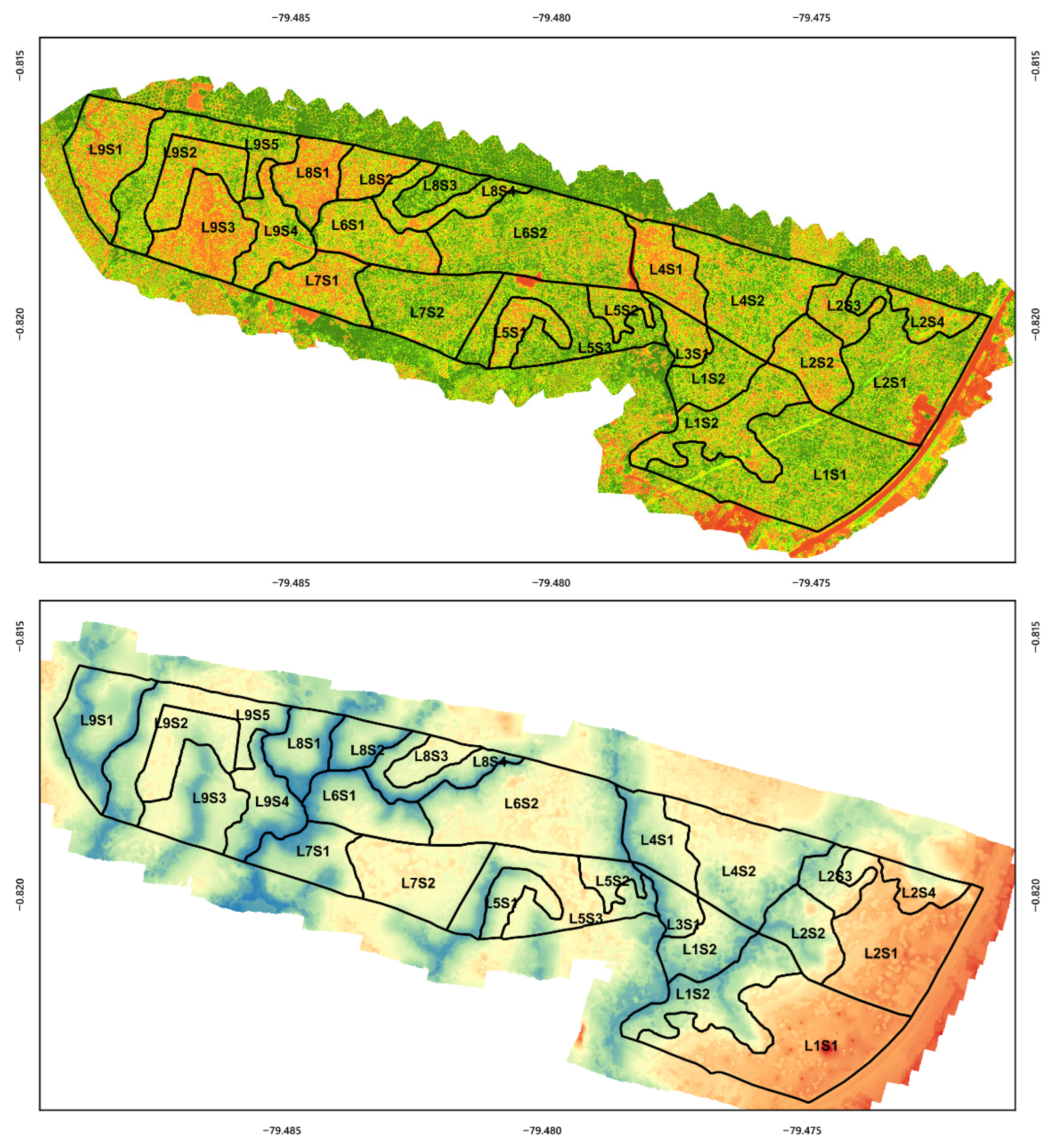 The work was conducted on a banana farm located in Buena Fe city (WGS84: lat −0.818409; long −79.479516), Los Ríos province, which is located in the central-north of Ecuador’s coastal region. Los Ríos province is Ecuador’s main banana yield province [14]. It has the following geophysical characteristics: altitude of 103 m.a.s.l., with a tropical rainy climate of 22.6 °C and 2257.85 mm of precipitation on average [15]. The study farm has an area of 75.2 ha (Figure 1) and is divided into 26 administrative plots that were further subdivided according to vegetation conditions, ensuring homogeneity for analysis. All data were collected during April 2024, corresponding to the final month of the agronomic cycle of the established Williams banana plantation, whose complete cycle spans approximately one year.