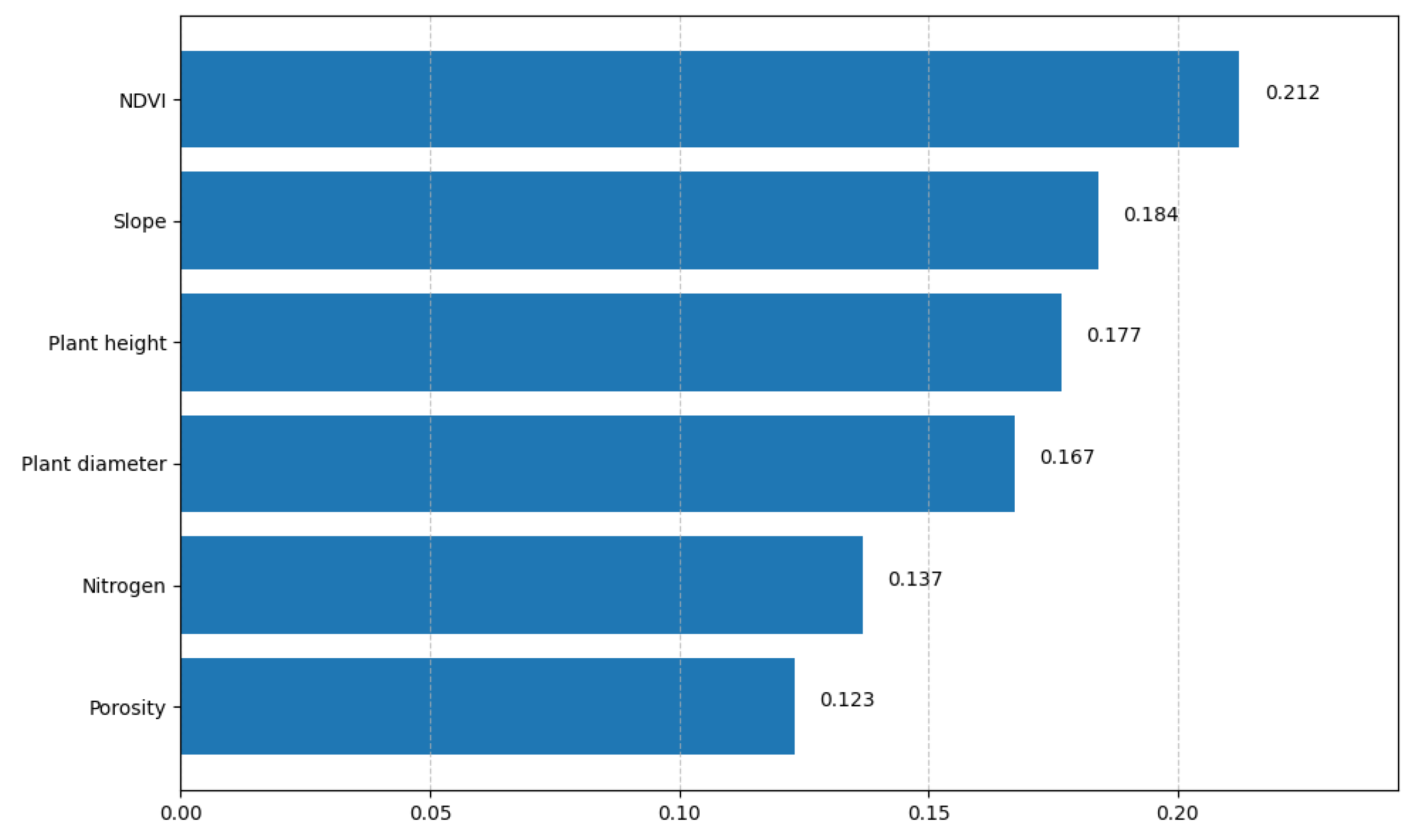 Figure 4 represents the variable importances of the RF model according to the mean decrease in impurity method. The values next to each bar are normalized importance scores; a longer bar indicates that the variable contributes more to prediction error reduction. NDVI is the most influential predictor (0.212), followed by slope (0.184), plant height (0.177), and plant diameter (0.167). The soil variables nitrogen (0.137) and porosity (0.123) have a smaller but still relevant contribution.