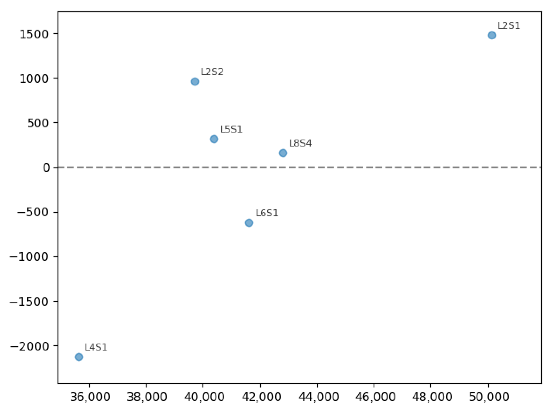 Residuals vs. predictions from the model. Each point is labeled with its plot case; the dashed line indicates zero residual, the X axis represents yield kg ha−1, and the Y axis represents residuals. Positive residuals represent underestimations, and negative ones represent overestimations.