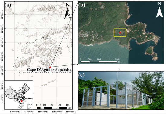Location of Cape D’Aguilar Supersite station (CDSS, indicated by red triangle). (a) Location of Hong Kong and CDSS in a map of China. (b) Location of CDSS in Hong Kong. (c) View from outside of CDSS.