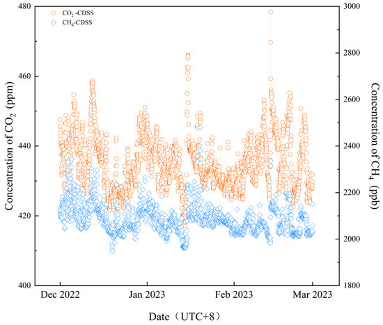 Time series of wintertime CO2 (orange circles) and CH4 (blue diamonds) levels observed at CDSS (December 2022–February 2023).