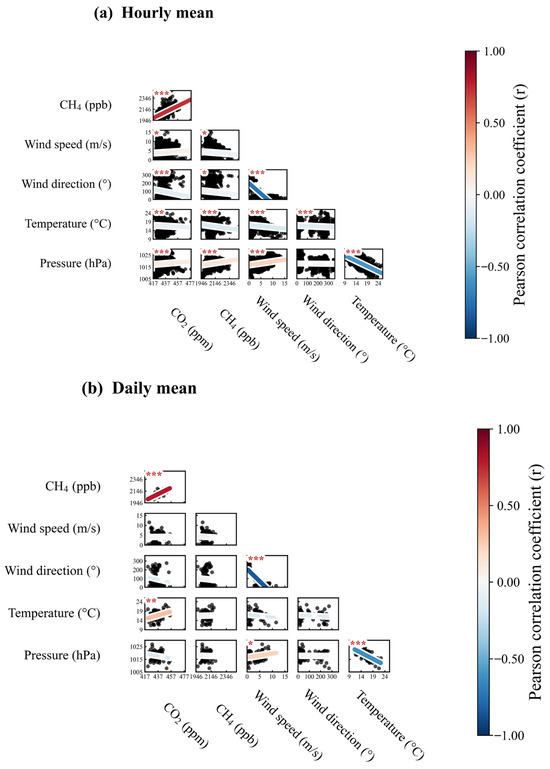 Scatterplot matrices for correlations between CO2 and CH4 concentrations and meteorological variables at CDSS: (a) hourly means; (b) daily means (December 2022–February 2023). Each panel shows a scatterplot of the variable in the row versus the variable in the column, with a straight line fitted by ordinary least-squares linear regression. The color of the fitted line corresponds to the color bar and indicates the Pearson correlation coefficient r for that variable pair (range: −1 to 1; warm colors denote positive correlations; cool colors denote negative correlations). Asterisks mark the significance of r: * p < 0.05, ** p < 0.01, and *** p < 0.001. Variables and units: CO2 (ppm), CH4 (ppb), wind speed (m s−1), wind direction (°), temperature (°C), and pressure (hPa).