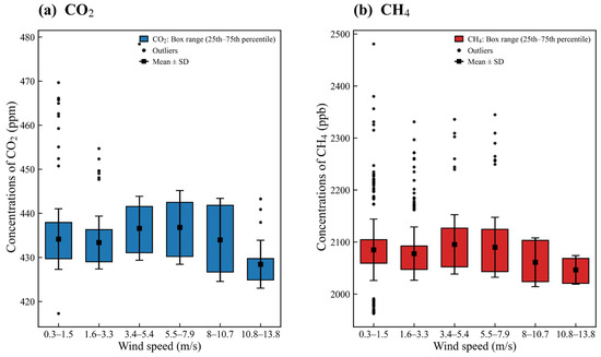 Box plots of (a) CO2 and (b) CH4 concentrations vs. wind speed (grouped into bins following the Beaufort scale classification). For each bin, the boxes represent the interquartile range (25th–75th percentiles); squares with error bars denote the mean ± 1 standard deviation. The outliers are points beyond Tukey’s 1.5 × IQR fences (interquartile range).