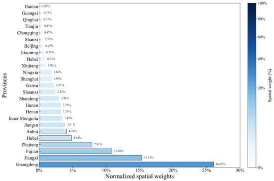 The normalized spatial weights are presented in Figure 5. Guangdong (26.05%), Jiangxi (15.35%), and Fujian (10.88%) emerged as the top three contributing provinces to Hong Kong GHG levels, while Guangxi (0.37%), Qinghai (0.37%), and Hainan (0.09%) contributed the least.