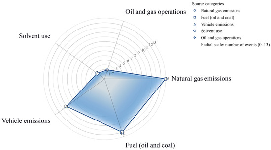 The resulting distribution (Figure 7) indicates that natural gas was identified in 33.33% of the source-category occurrences across the 13 events, followed by fuel combustion (30.77%), vehicular emissions (25.64%), and solvent use and oil and gas operations (5.13% each).
