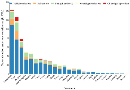 Guangdong, Jiangxi, and Zhejiang were the top three contributors, with estimated emissions of 142.67 kt CO2, 126.78 kt CO2, and 77.02 kt CO2, respectively. By contrast, Liaoning (1.38 kt CO2), Hainan (1.37 kt CO2), and Guangxi (0.36 kt CO2) contributed the least. This spatial distribution reflects disparities in provincial emission intensities as well as the complexity of cross-regional transport efficiency.