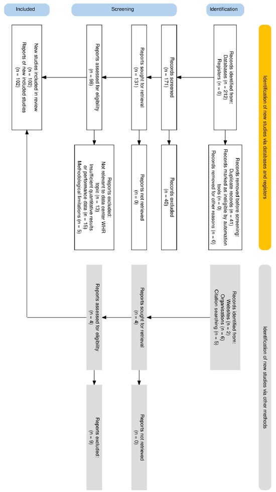 Inclusion criteria were predefined as follows: (i) clear relevance to data-center contexts; (ii) substantive treatment of waste-heat collection, upgrading, conversion or utilization and (iii) reporting of technical, environmental, and/or economic indicators (e.g., COP, thermal efficiency, PUE/ERE impact, CO2 reduction, CAPEX/OPEX, payback). Exclusion criteria were (i) non-English sources; (ii) studies unrelated to data centers without transferable methods; (iii) conceptual pieces lacking quantitative or engineering detail and (iv) duplicates or overlapping reports. Two reviewers independently screened titles and abstracts. Potentially eligible items then underwent duplicate full-text assessment. Disagreements were resolved by discussion or, when necessary, arbitration by a third reviewer. No automation or machine-learning tools were used. Data extraction used a standardized template that covered the technology route, operating conditions, performance metrics, environmental impacts, economic indicators and integration architectures.