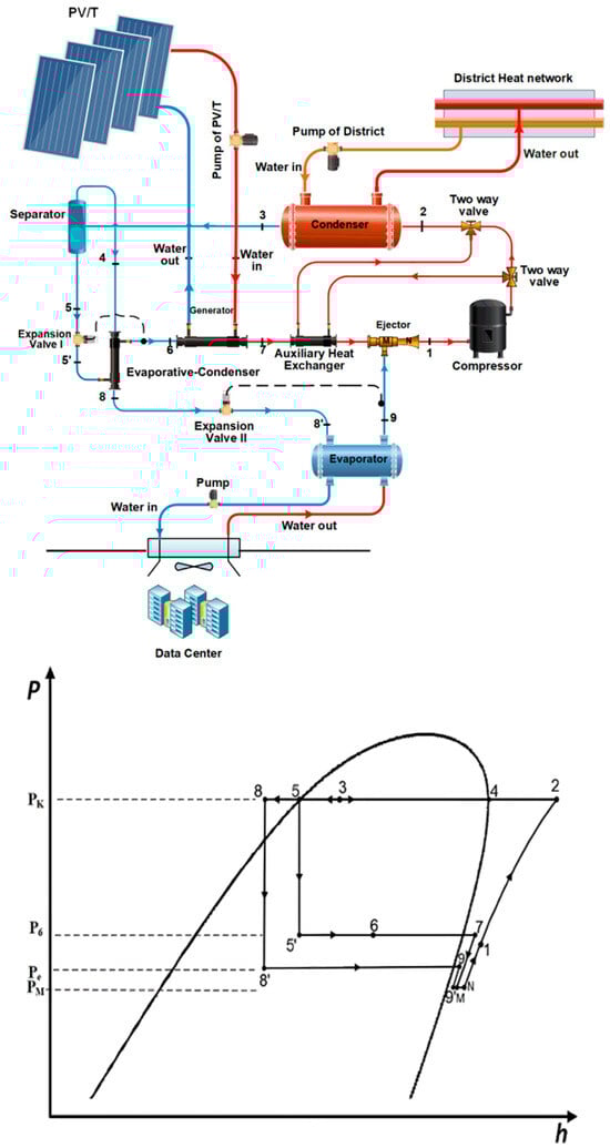 Schematic and P-h diagram of the proposed solar-driven ejector-compression system [].