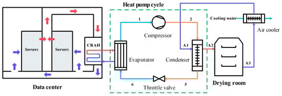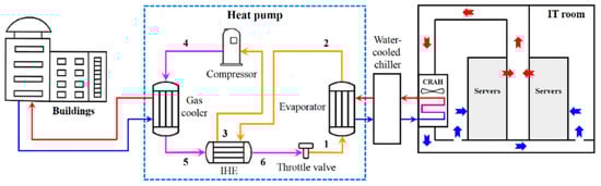 HPs are devices that transfer thermal energy from a low-temperature heat source to a high-temperature heat sink, serving as a key technology in the global transition toward secure and sustainable heating solutions []. Al-Sayyab et al. [] proposed a novel compound composite photovoltaic thermal (PV/T) waste heat driven injection–HP system, as shown in Figure 4, for simultaneous heating and cooling, utilizing waste heat to improve the system performance. The system utilizes PV/T waste heat with an evaporative condenser as the driving force for the ejector, while the generated electricity is used to operate the HP compressor and pump, and the experimental results show that coefficient of performance (COP) is improved by 54% and 49% in cooling and heating modes, respectively. In a tobacco drying application illustrated in Figure 5, Ge et al. [] utilized a heat pump to capture low-grade waste heat from a data center, elevating it to sufficient temperatures for drying processes. This approach effectively reduced fossil fuel consumption in tobacco production. For equivalent heat output, the data center waste heat drying system demonstrates superior thermodynamic and economic performance. Its specific moisture extraction rate exceeds that of air-source heat pump and coal-fired drying by 20.21% and 36.69%, respectively. The system also reduces carbon emissions by 567.16 kg and 1036.92 kg compared to these alternatives, improves energy reuse efficiency by 64.92% and saves 568.79 kWh per ton of tobacco processed. Meanwhile, a large amount of energy is consumed in heating every year; Jang et al. [] proposed a water source HP system, as shown in Figure 6, to reduce the energy consumption for heating and cooling in DC and residential areas. TRNSYS simulation compares the performance and operational characteristics of the present study with the conventional system. The average annual PUE of the DC is reduced from 1.26 to 1.23, and the ratio of the annual COP of the residential area is improved from 1.82 to 2.64. Life cycle climate performance analysis investigated the environmental impacts of the proposed system, which can reduce CO2 emissions by 28.7% compared to the conventional system. Li et al. [] conducted a case study based on a real data center in Beijing to analyze the economic and environmental benefits of a transcritical CO2 HPs. As illustrated in Figure 7, in this system, high-pressure CO2 further releases heat to the low-pressure CO2 in an internal heat exchanger (IHE) prior to the throttling process, thereby reducing the exergy loss during expansion. The system demonstrates a significant reduction in CO2 emissions by 12,880 tons annually. Moreover, the annual Energy Reuse Efficiency (ERE) can be decreased from 1.296 to 0.902, while the investment cost is reduced by 4.2% to 10.2%. The application of HP technology in WHR of DC shows significant energy saving and emission reduction effects, and different types of HP systems have unique advantages in improving energy efficiency, optimizing economy and reducing carbon emissions. These research results not only validate the feasibility of HP technology in the WHR of DC, but also provide an important technological reference and practical basis for the construction of green DC in the future.