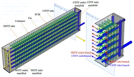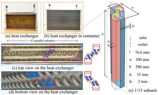 The details and diagram of the latent TES for DCs cooling. (a) Heat exchanger with fins. (b) The heat exchanger in container. (c) The top view on the heat exchanger. (d) The bottom view on the heat exchanger. (e) The diagram of the subunit used in the numerical model [].