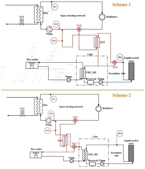 Air-cooling systems in data centers rely heavily on numerous air conditioning units and fan equipment. Not only do such systems exhibit limited cooling efficiency under high-density workloads, but they also consume substantial amounts of energy, making it difficult to meet increasingly stringent energy efficiency demands. Furthermore, constrained by ambient temperature conditions and the additional thermal load generated by the operation of cooling equipment, traditional air-cooling systems face significant challenges in reducing energy consumption and improving overall operational efficiency []. To address these issues, researchers have begun to explore technical ways to utilize waste heat from DCs for cooling, and to achieve energy laddering through the recycling of WHR to both reduce energy consumption and improve the overall system efficiency []. Haywood et al. [] investigated the use of waste heat from DCs to drive the 10-ton single-effect lithium bromide–water (Li-Br) absorption refrigeration system shown in Figure 11 for reducing the cooling load of a computer room air conditioner (CRAC). This heat-driven system uses lithium bromide salt as the absorber and water as the refrigerant. They expect to capture 85% of the heat generated by the central processing unit (CPU) and circuit board work in the DC, and when supplemented by external heat provided by solar heat, the PUE value can be less than 1. It greatly reduces the cooling load of the traditional machine room air conditioning CRAC, and ultimately reduces the grid energy consumption of the DC. Huang et al. [] proposed that after obtaining heat from high-performance components such as processor and memory, the coolant is further heated by solar collectors and then enters into dual-effect absorption refrigeration system. The annual electricity savings from cooling achieved by the waste heat recovery system amount to 27,978 kWh, leading to a reduction in CO2 emissions of 23.9 tons. This significantly lowers energy consumption and greenhouse gas emissions. With a payback period of approximately 4.3 years, the system demonstrates considerable economic potential and practical value. Lu et al. [] modeled and compared two different WHR scenarios, as shown in Figure 12, using TRNSYS 18 software by connecting the heat demand side to the secondary (Scheme 1) and primary (Scheme 2) sides of the cooling distribution unit. Both scenarios were profitable within one year and resulted in significant CO2 emission reductions, with annual electricity savings of 2290.5 kWh and 905.2 kWh for Scenario 1 and Scenario 2, as well as CO2 emission reductions of 291,996 kg and 258,192 kg, respectively.
