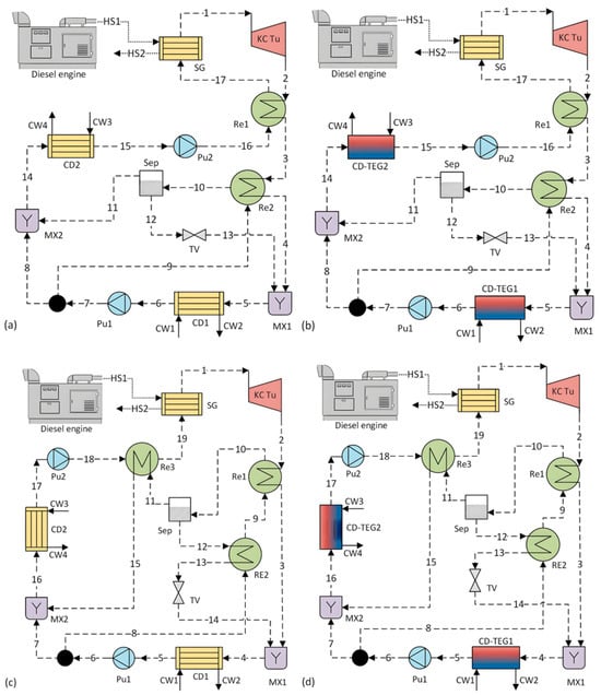 Schematic diagram of WHR system based on KC. (a) Simple KC 1. (b) Enhanced KC 1. (c) Simple KC 2. (d) Enhanced KC 2. [].