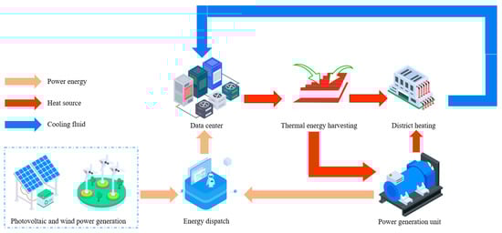 In view of the concurrent trends of continuously escalating computing power and tightening carbon constraints, the core mission of green DC has shifted from single-point energy reduction to integrated system optimization encompassing electricity, heat and cooling. Cooling and heat dissipation constitute the primary energy demands in DCs, with their consumption becoming increasingly prominent as computational density and processing capabilities advance. Achieving minimal energy consumption while ensuring computing power, reducing environmental impact, and shortening investment payback periods have become major challenges in global green DC construction [,,,,]. Figure 15 illustrates a closed-loop system demonstrating the transformation of data centers from passive energy consumers to active nodes in campus/urban energy networks. The technical pathway is as follows: “PV/Wind Power→Data Center Operation→Waste Heat Harvesting →Power Generation→District Heating→Cooling Water Return→Energy Dispatch.” Through cross-temporal optimization of electricity, heat, cooling and storage flows, this integrated approach enables a synergistic improvement in key metrics including PUE, Energy Reuse Effectiveness (ERE) and Carbon Usage Effectiveness (CUE). Within this framework, DC transforms from mere energy consumers into comprehensive energy units capable of providing heat, flexibility and ancillary services.