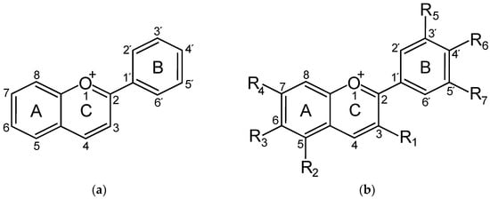 Chemical structure of: (a) flavylium cation and (b) anthocyanidins (R1: H, or OH; R2: H, OH, or OCH3; R3: H, or OH; R4: OH, or OCH3; R5: H, OH, or OCH3; R6: OH, or OCH3; R7: H, OH, or OCH3).