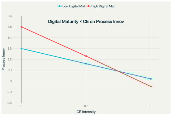 Crucially, the interaction term between CE_INT and DMI is negative and significant (coefficient = −0.40, p < 0.05). This means that digital maturity, rather than amplifying the positive effect of circular economy intensity on process innovation, actually weakens it. As a result, high levels of digital maturity reduce the already weak effect that circular economy practices have on process innovation outcomes.