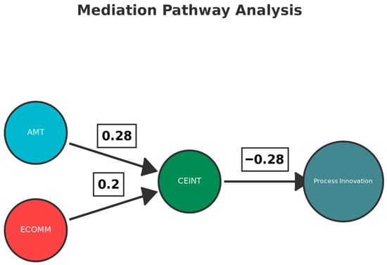 These findings suggest that, while AMT and e-commerce foster greater engagement in circular economy practices, higher circular economy intensity does not mediate a positive effect on process innovation; in fact, it predicts a reduction in process innovation levels. This result contradicts the expectation that circular economy adoption would serve as a constructive bridge between technological advancement and process innovation. Instead, the mediating role of CE_INT is negative in this sample and context (see Table 6).
