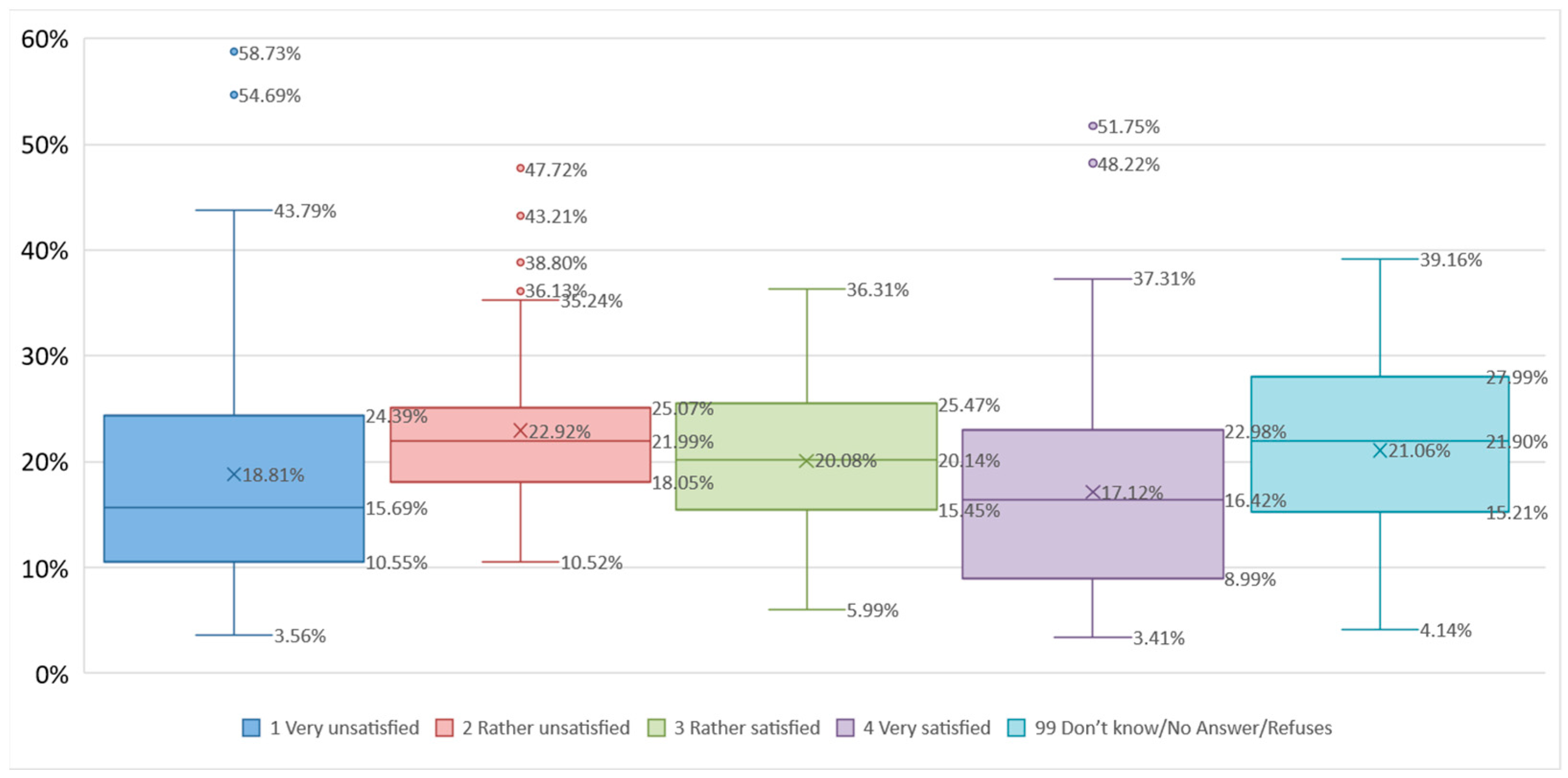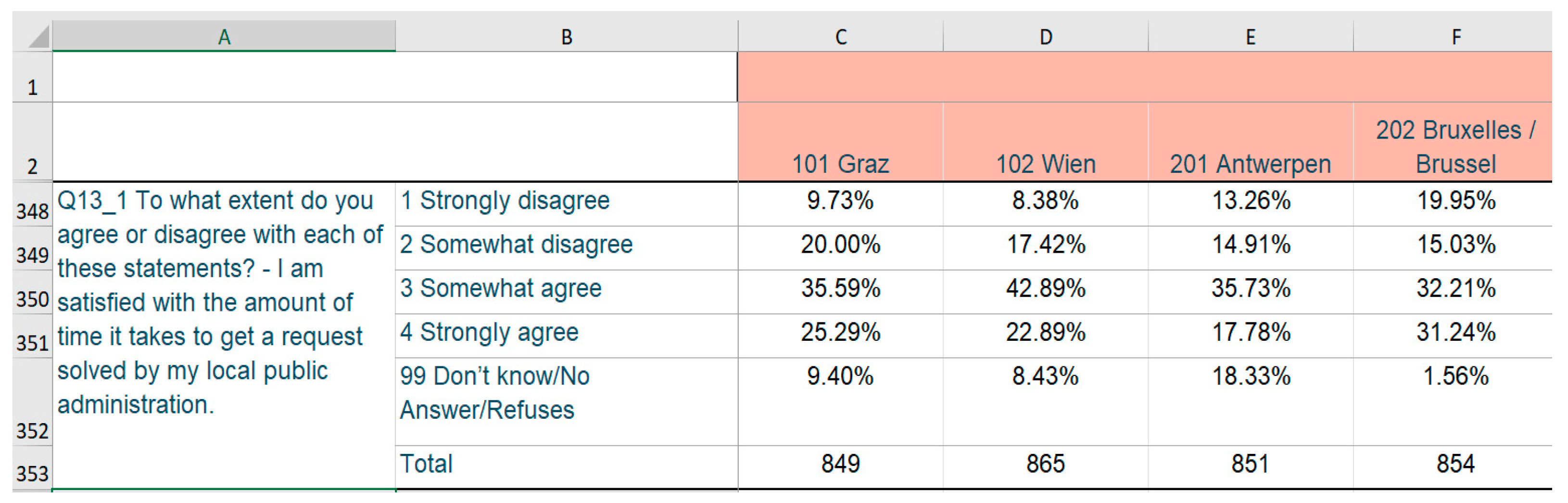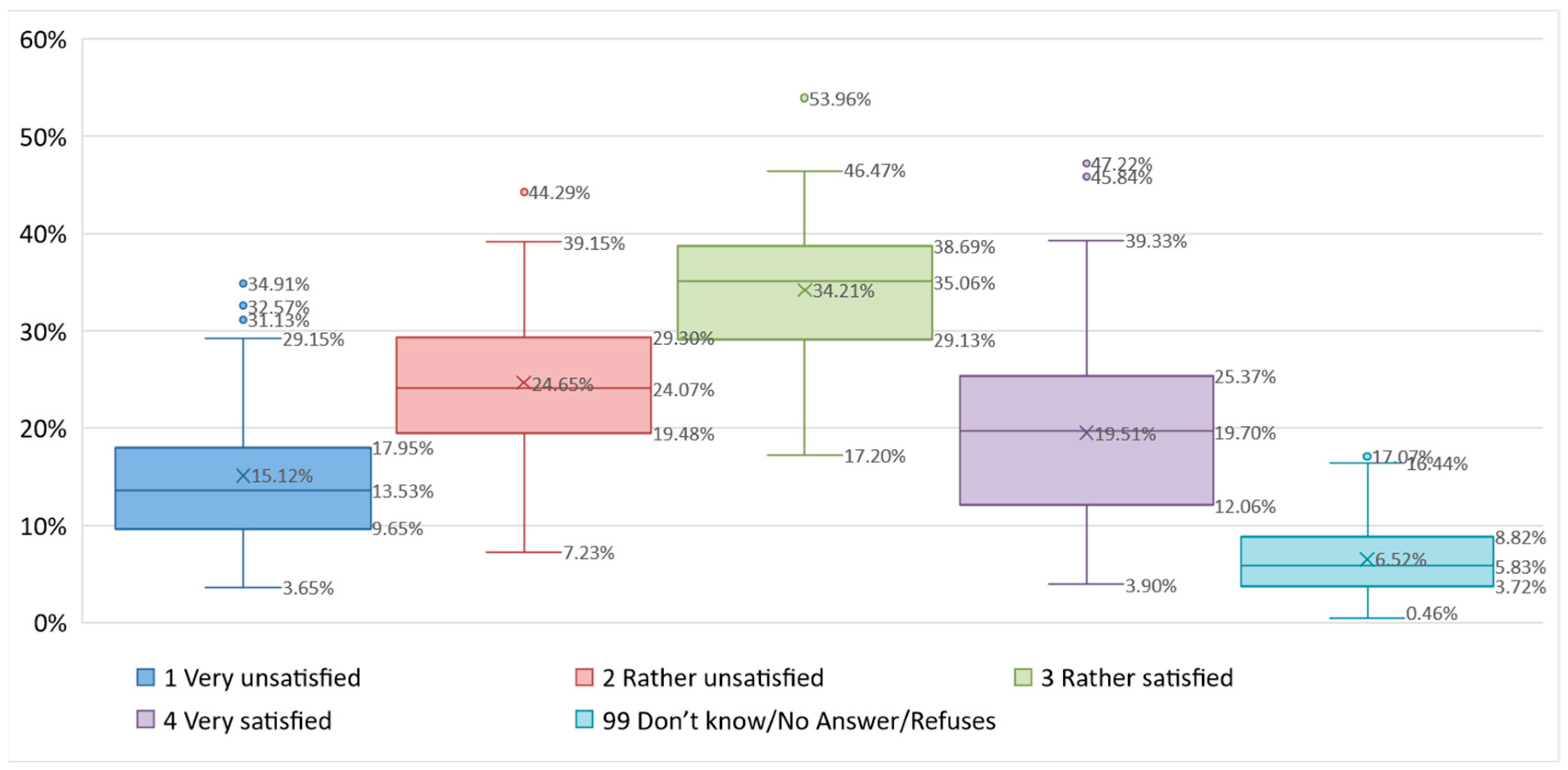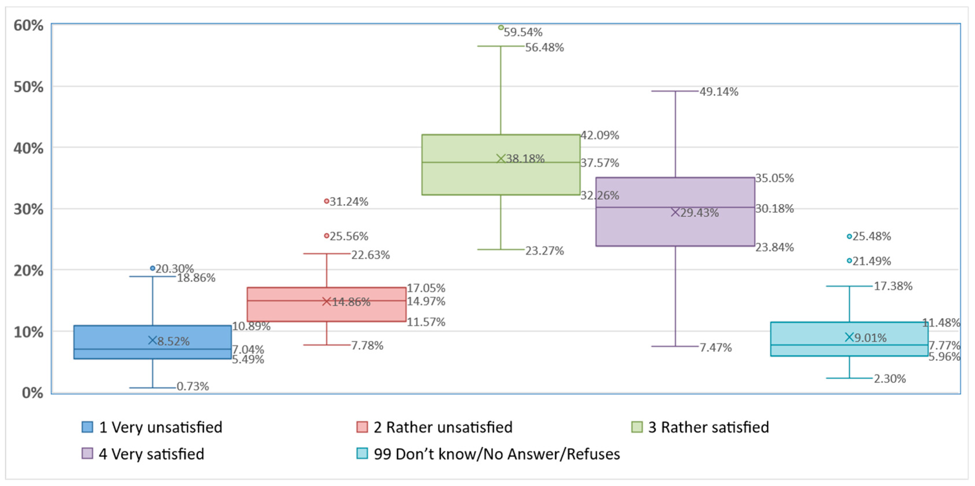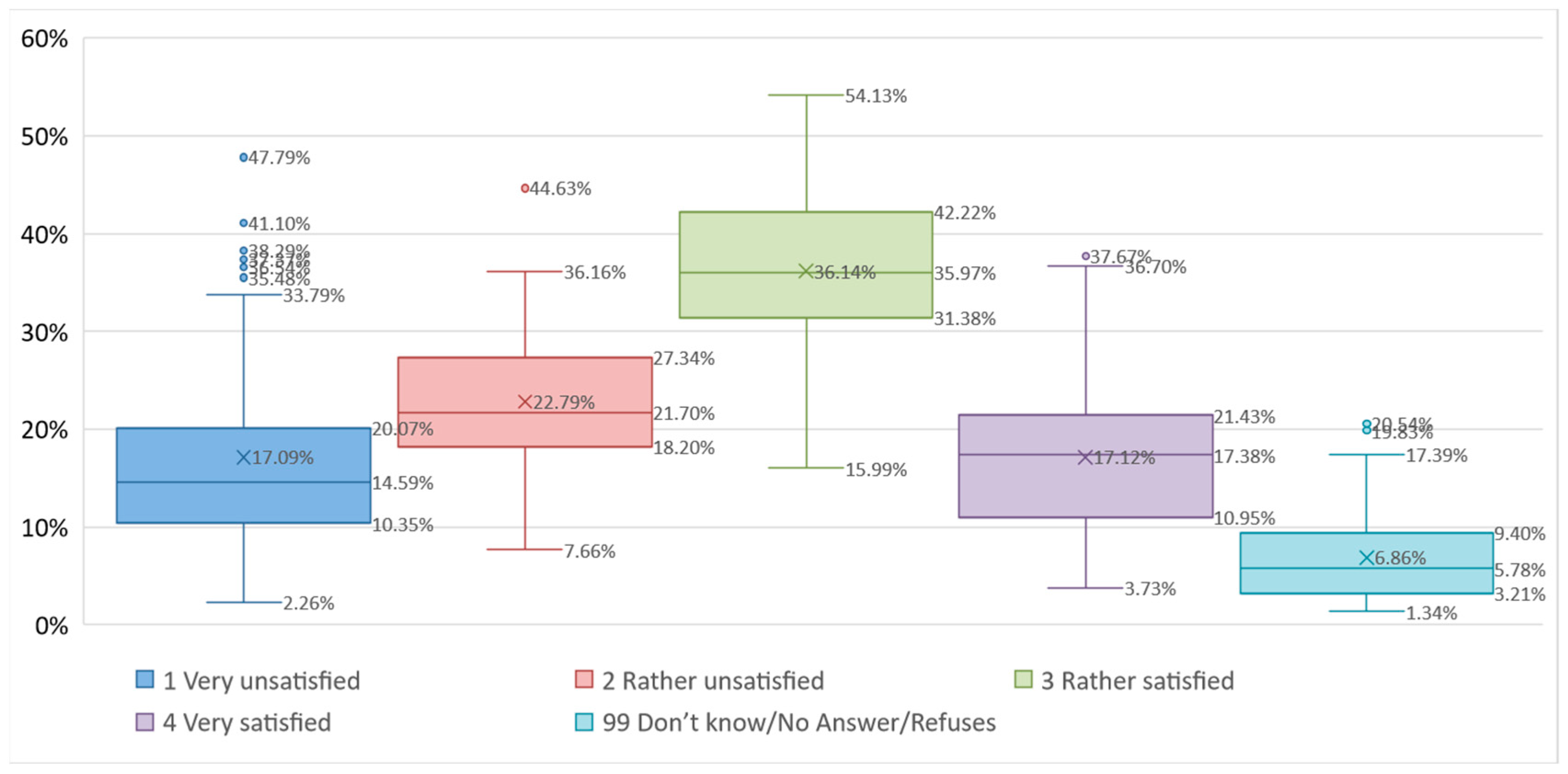 - Q4: Are there inter-regional variations in perceived satisfaction with public administration across European cities in 2023?