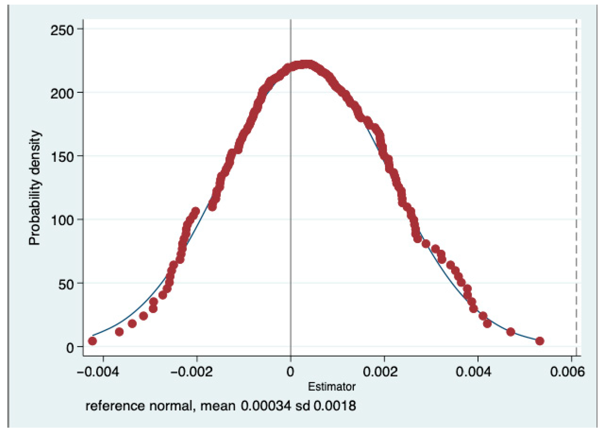 To eliminate the concern that the increase in financialization is triggered by other random factors, instead of the pilot policy, we conducted a placebo test by simulating the randomized effect of GFRI on specific areas by generating a computer-randomized treatment group and running the benchmark model using the simulated treatment groups. This process was repeated 500 times, and we expected that the coefficient of the interruption term of randomized treatment group and post would not be significantly different to zero.