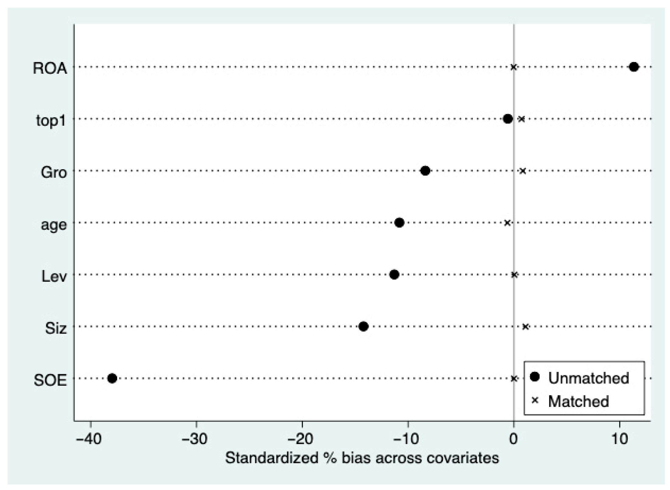23]. Specifically, firm size (Siz) is measured by the natural logarithm of total assets, growth potential (Gro) is measured by the growth rate of total assets, leverage (Lev) is measured by the ratio of total liabilities to total assets, return on assets (Roa) is measured by the ratio of net profit to total assets, firm age (Age) is measured by the age of the firm, ownership concentration (Top) is measured by the percentage of shares held by the largest shareholder, and property rights (Soe) is a dummy variable whose value is 1 for state-owned enterprises and 0 for non-state-owned enterprises.