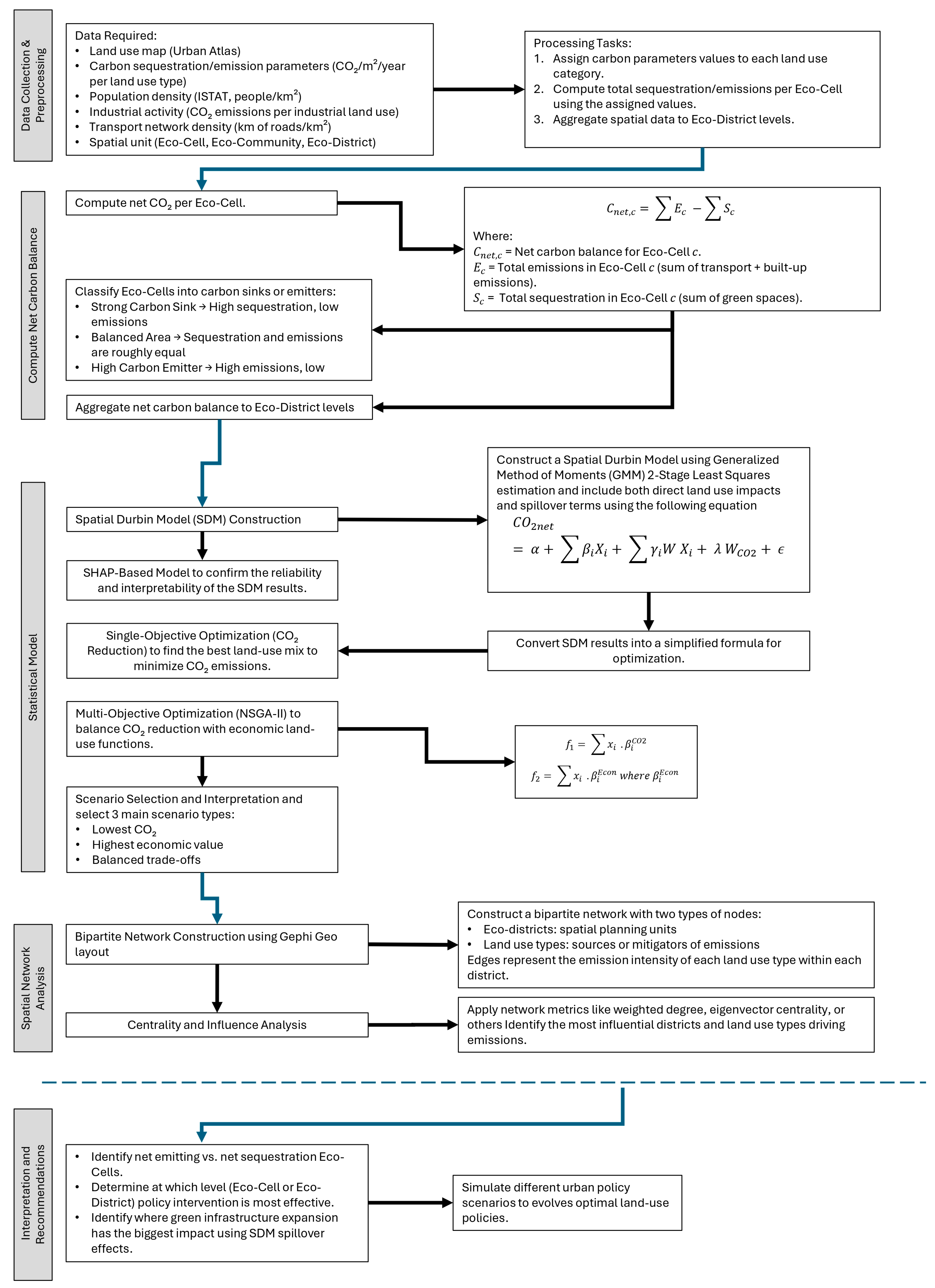Consequently, there is a need for an analytical framework that integrates these spatial interdependencies within urban areas while remaining compatible with existing land-use data. This research addresses that gap by proposing a network-based spatial analysis that models the urban CO2 landscape as a system of interlinked functional relationships between spatial units and land uses [24].