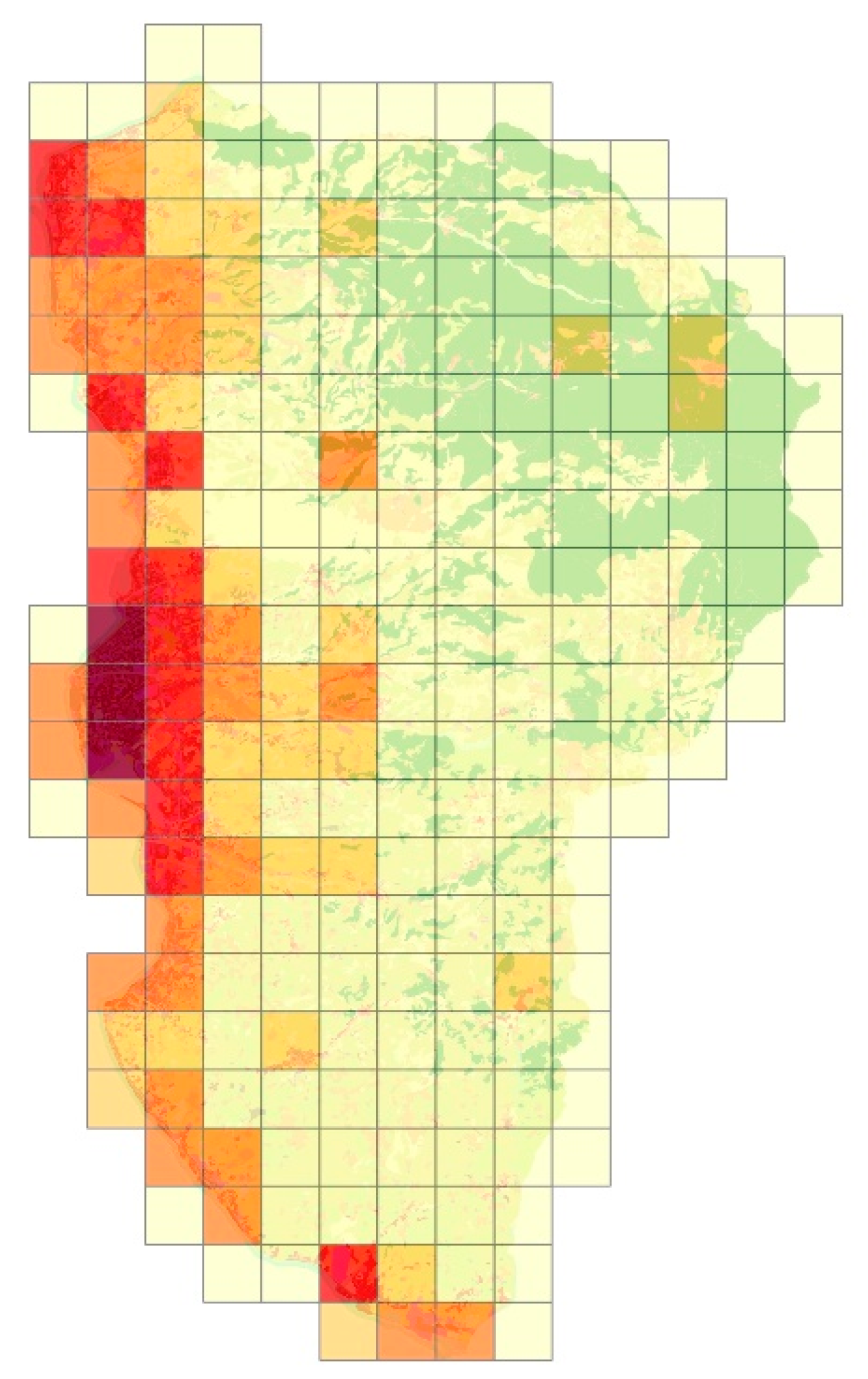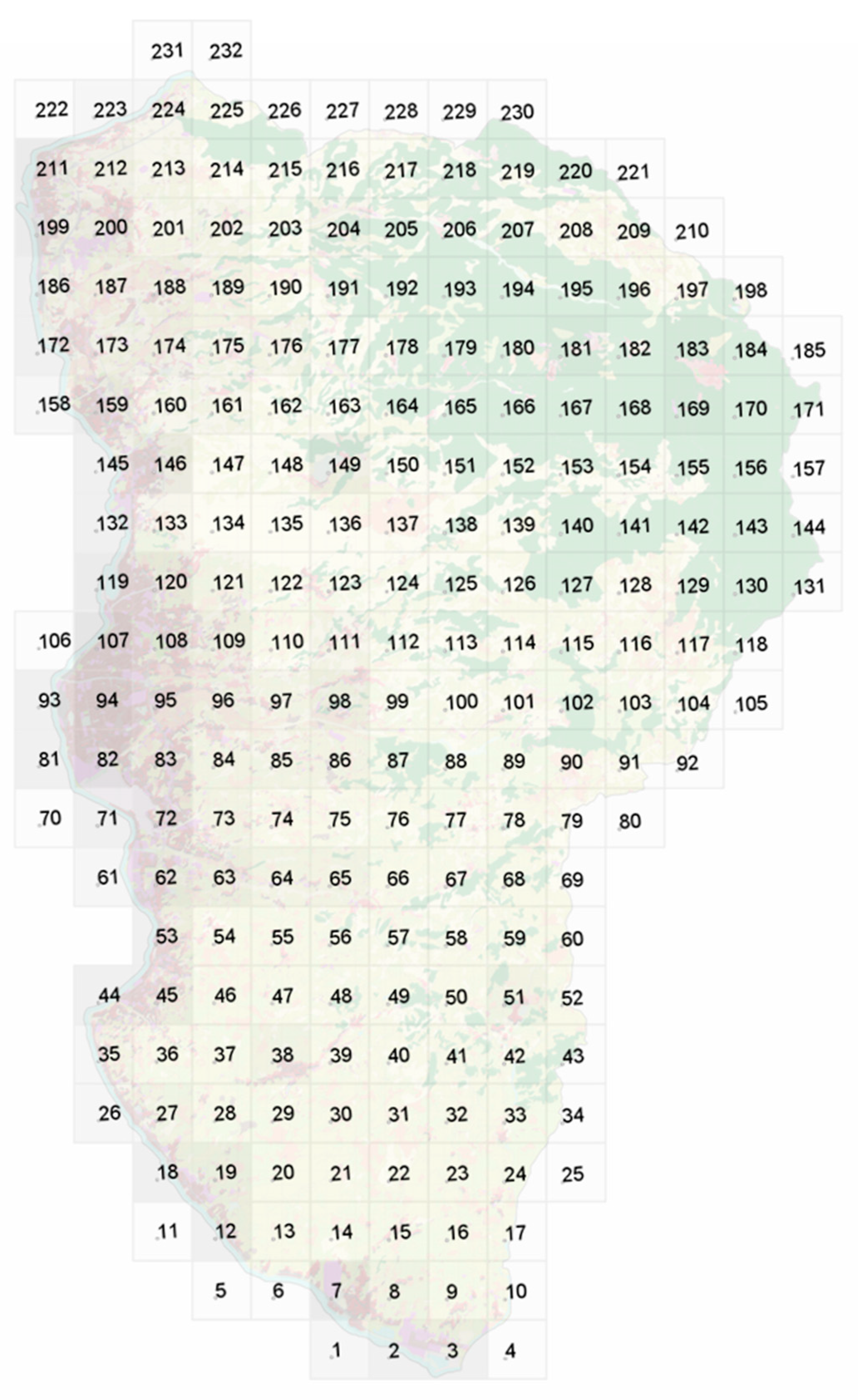Urban Atlas, developed by the Copernicus Land Monitoring Service, offers standardized and detailed land-use classifications for European Functional Urban Areas. Although not a legal substitute for official zoning regulations, it generates a consistent spatial dataset to support uniform land-use analysis among different urban contexts. Urban Atlas data are used in this study as a proxy for land-use zoning because of its consistent classification and spatial resolution, and thus is particularly well-suited for comparative and analytical research. However, its minimum mapping unit (MMU) of 0.25 ha (2500 m2) for urban classes and 1 ha (10,000 m2) for rural classes is less than ideal for the functional analysis of urban ecosystem services. To address this gap, this study uses a hierarchical system of spatial units. This framework divides the territory into 232 eco-districts (1600 m × 1600 m).