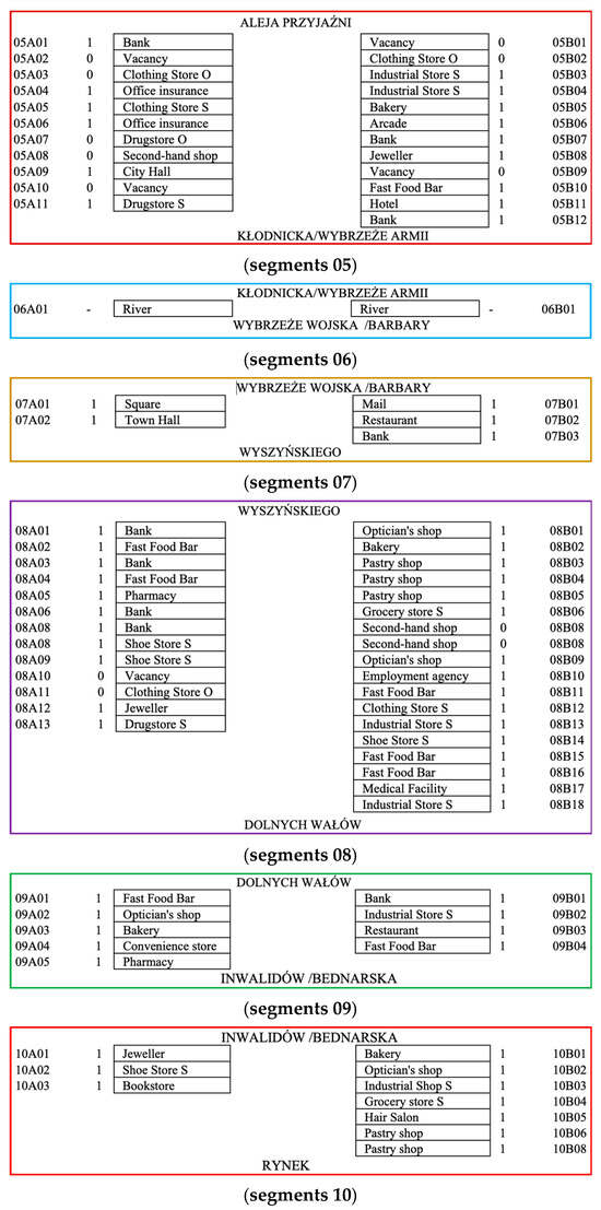 Step 2. The construction of a table (matrix) of the vicinity relations of inventoried urban spaces within the individual sections of the studied street was undertaken based on the recorded inventory structure of urban space use and the collective classification table of urban space use types. The representation of neighbourhood relations in the form of a graph was applied solely as an auxiliary tool.