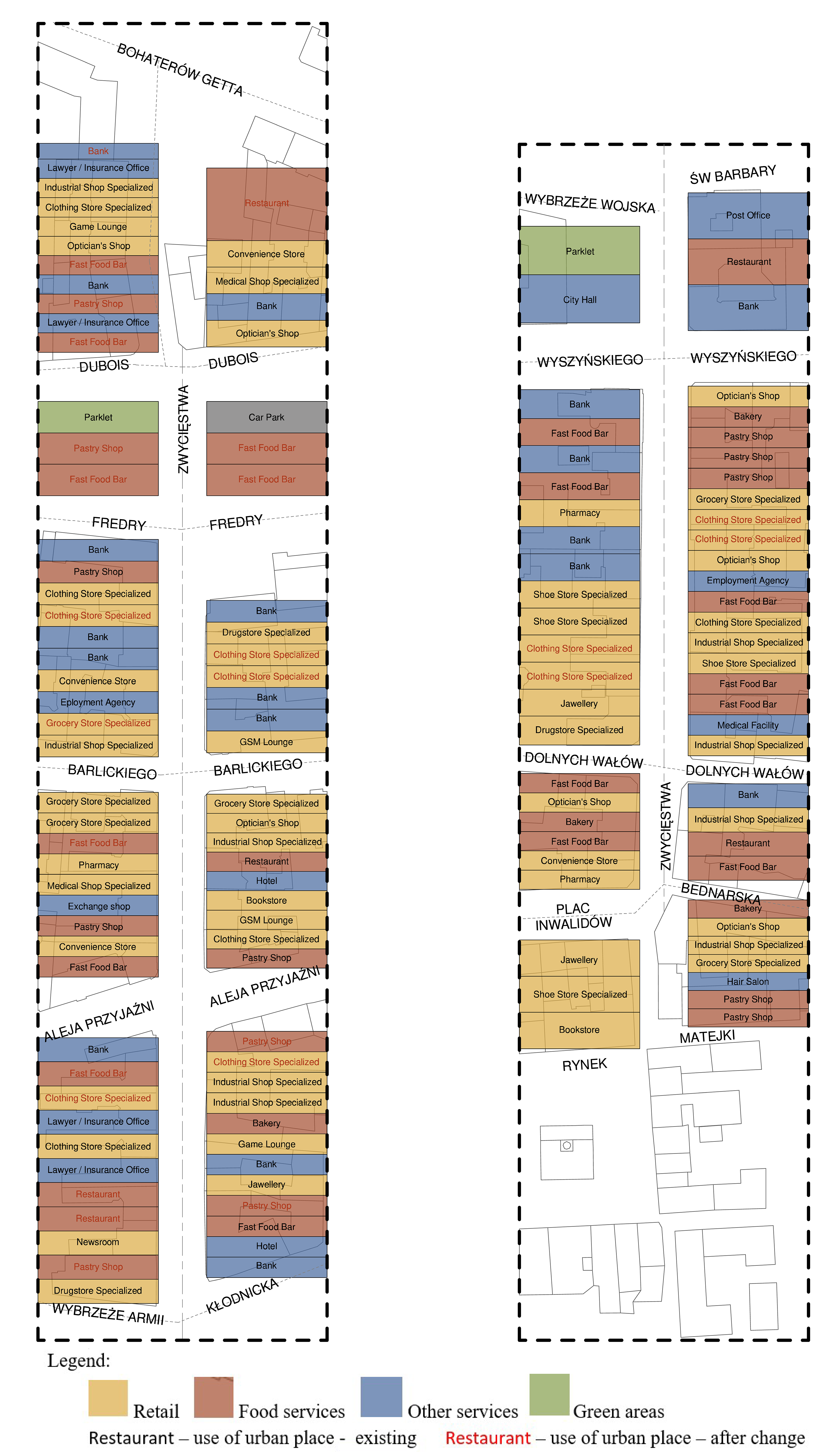 - The considerable number of bank branches, post offices, and second-hand retail outlets dominating the structure of urban places use along Zwycięstwa Street should be interpreted in a similar manner.