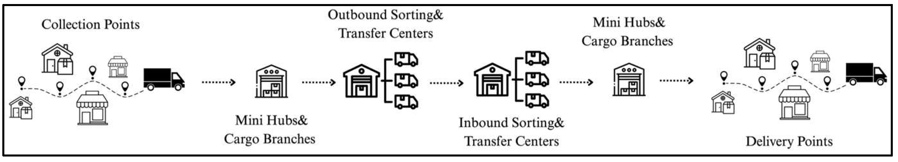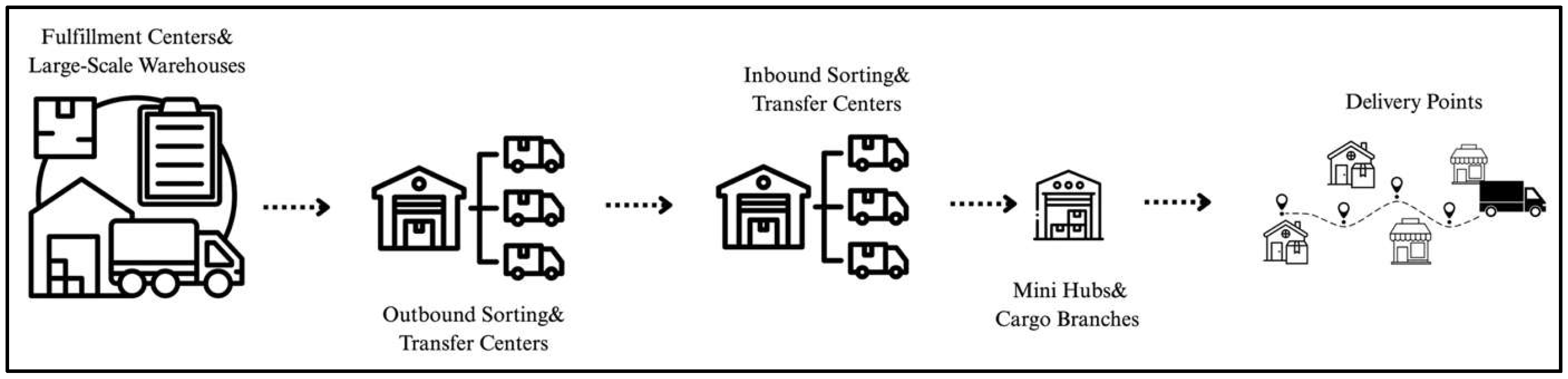 13]. This hybrid logic, combining demand proximity with regional connectivity, demonstrates how e-commerce is transforming the “core-periphery” dynamics of logistics in urban areas [
