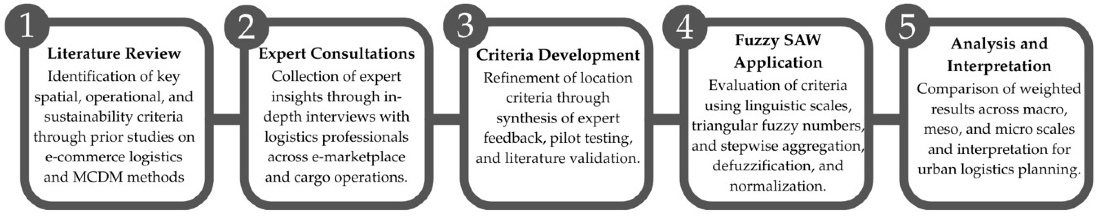 This section outlines the methodological approach employed in the investigation. The research elucidates the integration of expert perspectives, literature findings, and fuzzy multi-criteria assessment to evaluate the spatial priorities of logistical facilities across various scales.