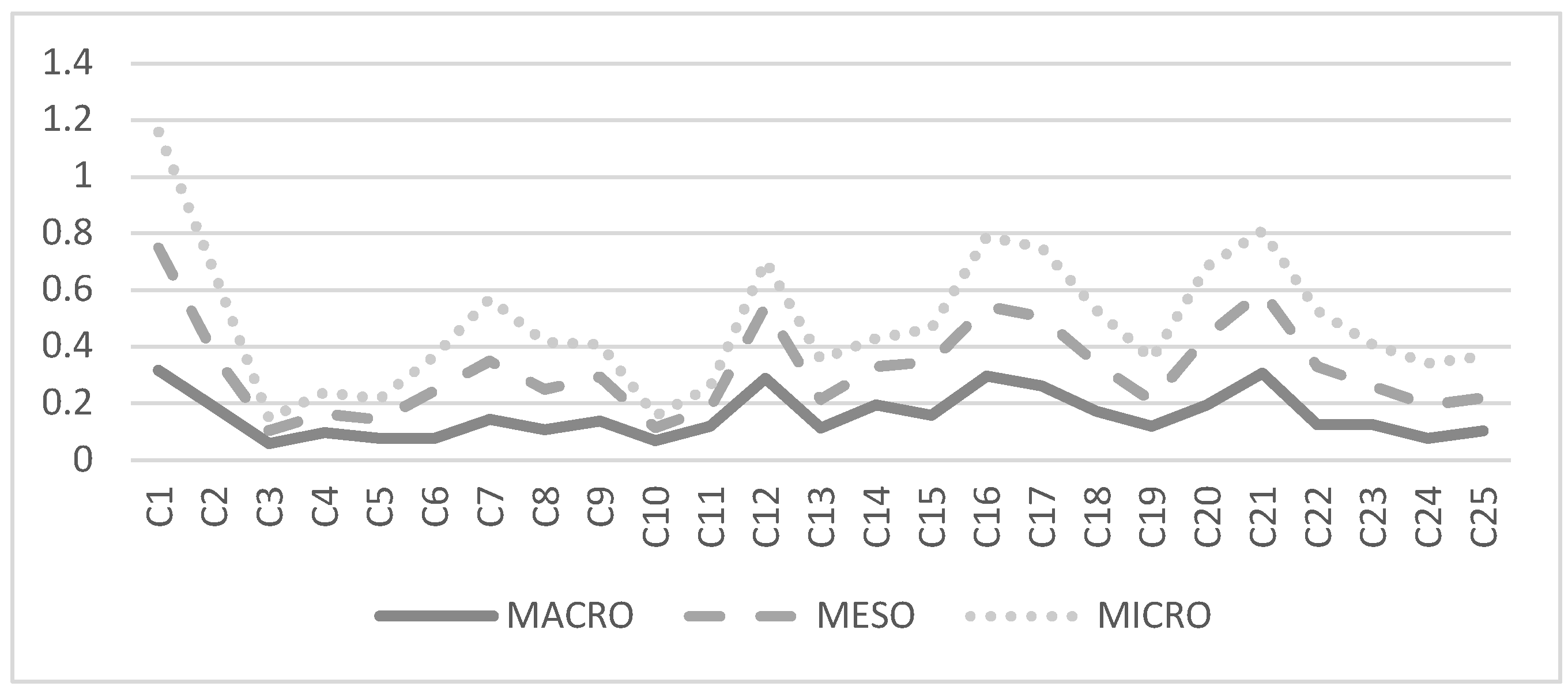 Table 5, showing the differences in relative importance across scales. At the macro-scale, proximity to main arteries (C1), land rental values (C21), and population density (C16) emerged as the most significant factors. At the meso-scale, proximity to main arteries (C1) remains the dominant criterion, followed by land rental values (C21) and proximity to shopping malls (C12). At the micro-scale, proximity to main arteries (C1) again takes the lead, while proximity to intermediate arteries (C2) and population density (C16) rank second and third, respectively. In contrast, criteria such as proximity to railway routes (C3) and proximity to industrial zones (C10) consistently occupy the lowest ranks across scales, suggesting their limited influence on e-commerce logistics facility location decisions within the Istanbul context.