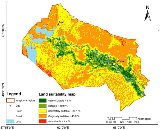 Within the study region highly suitable areas (S1) account for 5% of the total land area (11,300 km2) (refer to Figure 3). These zones are primarily concentrated along the Syrdarya river and its tributaries, where access to irrigation water is reliable, and topographic conditions are highly favorable. Proximity to perennial water sources and fertile alluvial soils make these territories exceptionally advantageous for intensive agricultural production. However, around 30% of the S1 lands remain uncultivated, mainly distributed across the Karmakshy, Shieli, and Zhalagash districts. The limited utilization of these highly suitable areas is largely attributed to insufficient irrigation infrastructure, poor transportation accessibility, and the high costs associated with developing new irrigation systems. Suitable areas (S2) cover 10.6% of the total land area (23,956 km2). These areas present minor, manageable constraints and generally favorable farming conditions. Moderately suitable areas (S3) comprise 36.1% of the land (81,586 km2). While these areas exhibit agricultural potential, overcoming specific limitations requires strategic planning and efficient resource management. Marginally suitable areas (S4) represent 43.9% of the total land area (99,214 km2). Severe constraints hinder traditional farming practices, but innovative methods could unlock their latent potential for limited agricultural use. Not suitable areas (N) constitute 4.4% of the total land (9944 km2). These regions are unsuitable for agriculture due to poor soil quality, challenging topography, or lack of water resources.
