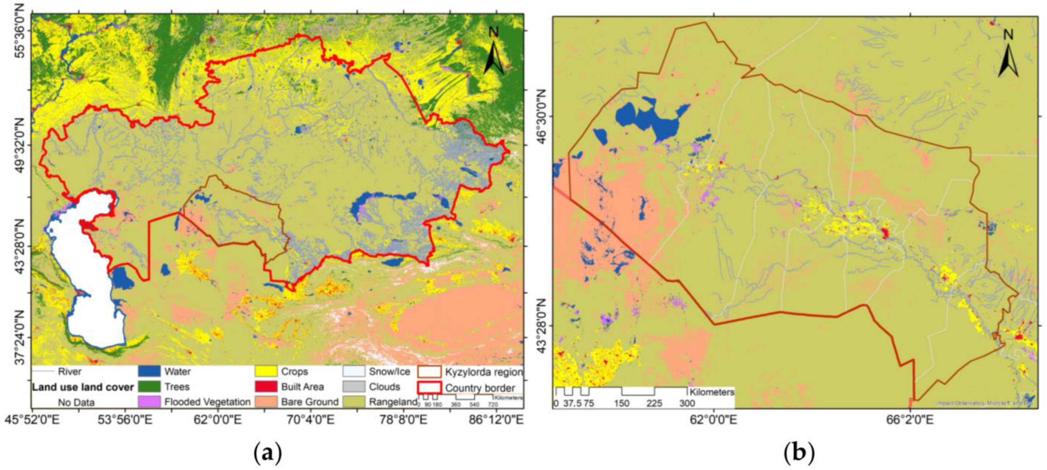 - Kassymova, S.; Yegemberdiyeva, S.; Mustafayev, K. Environmental and socio-economic aspects of sustainable development in Kyzylorda Region. Econ. Ser. Bull. L. N. Gumilyov ENU 2023, 2, 9–26. [Google Scholar] [CrossRef]