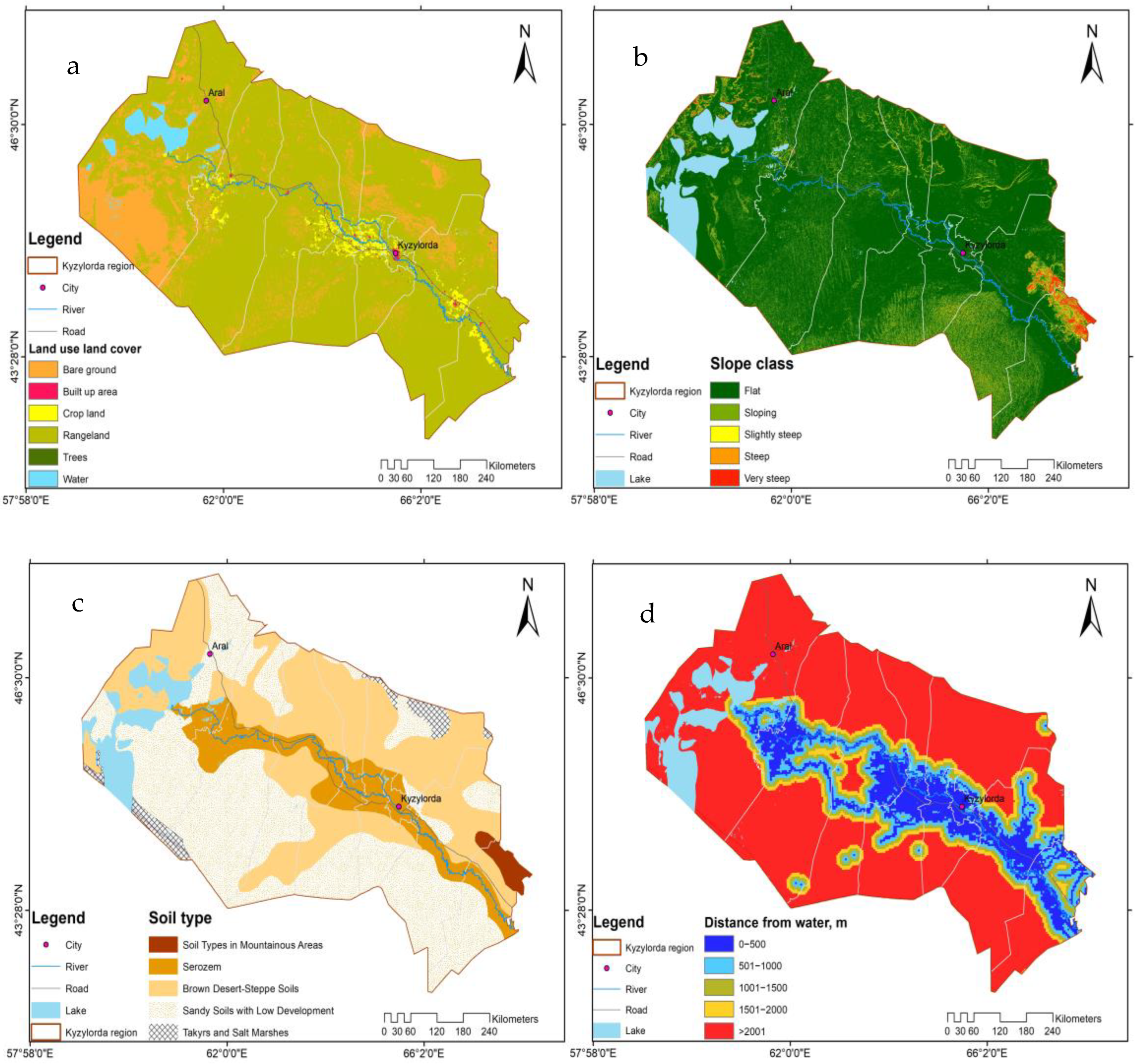 | Factor | Distance from Water Source | Soil Type | LULC | Slope | Criteria Weight |