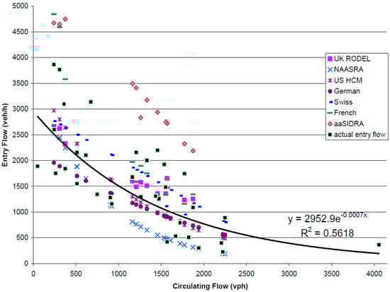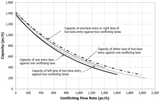 The first equation represents a regression-based best-fit model, which is consistent with the observed critical time periods. On the other hand, the second equation shows consistency with the observed critical time periods in both queued and non-queued conditions. Figure 3 shows the relationship between the inlet capacity of both single-lane and multi-lane roundabout entrances and the circular flow rate, expressed in passenger vehicles per hour (pc/h). As shown in the figure, the maximum inlet flow (vehicles/hour) gradually decreases with increasing circular flow [].