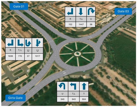 Traffic data were collected through loop detectors and field observations conducted by three independent field teams to validate the accuracy of vehicle counts. Data collection processes covered all three approaches of the roundabout during the morning peak period (7:30 AM–8:30 AM), identified as the most congested hour of the day based on field observations, coinciding with the beginning of morning classes at 8:00 AM. As previously mentioned, and according to data from the Jeddah Transport Company (JTC), buses and high-occupancy vehicle (HOV) trips account for approximately 2% of the total traffic volume and are stochastically distributed across the network. The remaining trips are made by private passenger vehicles. Furthermore, the proposed condition is validated using a density map generated from the base condition to verify spatial consistency of congestion patterns. The capacity estimation of the roundabout is carried out using methodologies derived from the Highway Capacity Manual (HCM), as well as the empirical models proposed by Al-Madani et al. and Sindi.