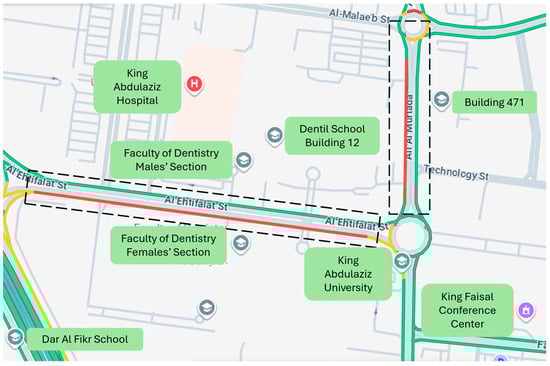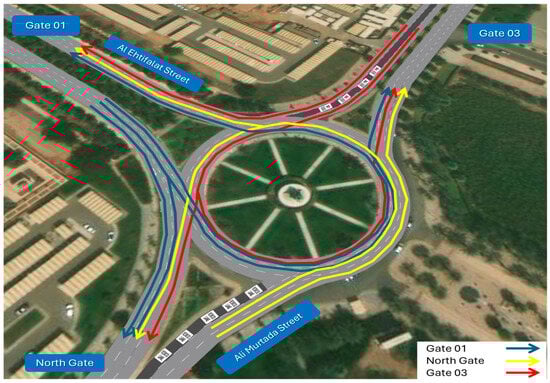 The present research addresses this gap by studying the 50-Years Roundabout at King Abdulaziz University (KAU) in Jeddah, Saudi Arabia as a case study for applying lane restrictions. This roundabout—named in honor of the university’s 50th anniversary—is a critical junction on campus that has become notorious for severe traffic congestion during morning peak hours. Situated at the intersection of two major campus arteries (Al-Ehtifalat Street and Ali Murtada Street, near main gates 1 and 3), the roundabout connects key facilities including academic buildings, a large hospital, and administrative centers. It serves as the primary circulation point for a vast number of daily commuters. KAU enrolls over 11,000 students, and according to recent transportation surveys, approximately 98% of these students (along with thousands of staff and faculty) commute to campus by private vehicles []. This translates to an influx of more than 50,000 vehicle trips to the university each weekday morning, about 60% of which enter through the main gate that feeds directly into the 50-Years Roundabout []. The result is that demand at this roundabout far exceeds its nominal handling capacity each morning, leading to gridlock conditions that ripple through the campus road network. Field observations in 2024 documented extreme delays as vehicles have been recorded waiting on the approach at the height of the rush hour for a very long time []. Such congestion not only causes frustration and tardiness but also heightens the risk of collisions due to the dense packing and frequent stop-and-go situations observed. Improving traffic flow at this node is therefore of great importance to KAU’s overall mobility, safety, and sustainability.