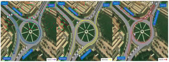 The proposed condition is aimed at reducing conflict points, thereby improving traffic flow and enhancing both operational efficiency and safety within the roundabout. Within this condition, three movements approach the circulating lanes from Gate 01, corresponding to the three available entry lanes. Each lane is dedicated for a specific movement to ensure smoother merging and minimize potential weaving conflicts. Specifically, the leftmost lane is assigned for left-turn and U-turn movements only while approaches from the north gate are restricted to two entry lanes. The right lane is dedicated for through movements only, while the middle lane accommodates left-turn and U-turn movements. The leftmost lane at this approach is closed (restricted) to prevent unnecessary conflicts and optimize lane utilization.