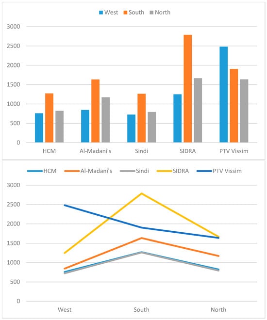 As presented in the table above, the differences between the HCM and Sindi models are minimal and statistically insignificant. The Al-Madani model performs reasonably well for three-lane entries, but it fails to accurately estimate the capacity for two-lane entries with three-circulating lanes, as it was originally developed for three-entry and three-circulating lane configurations. Both SIDRA Intersection and PTV Vissim tend to overestimate capacity, and therefore, neither model provides sufficiently reliable estimates for this specific roundabout configuration. In contrast, Sindi’s model yielded the lowest capacity values, which can be attributed to its analytical foundation that explicitly considers gap-acceptance behavior, headway distribution, and pedestrian interactions (when present).