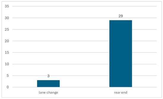 The Surrogate Safety Assessment Model (SSAM) was utilized to evaluate traffic safety performance and to compare the base and proposed conditions in terms of conflict type and severity. The software, developed by the Federal Highway Administration (FHWA), provides a robust analytical framework for assessing traffic safety through vehicle conflict analysis. In this study, SSAM was employed to analyze vehicle trajectory files generated from PTV Vissim simulations. SSAM classifies conflicts by conflict angle, identifying three primary types: rear-end, lane-change, and crossing. In addition, it assesses the severity of each conflict using the Time-to-Collision (TTC) metric. Figure 16 illustrates the number and types of conflicts for the base condition, whereas Figure 17 presents the same outputs for the proposed condition. A notable reduction in conflicts is observed between the two scenarios. Under the base condition, a total of 1141 conflicts were recorded, consisting of 839 rear-end, 300 lane-change, and 2 crossing conflicts. In contrast, the proposed condition produced only 32 conflicts, including 29 rear-end and 3 lane-change conflicts. This represents an approximate 97% reduction in total conflicts, demonstrating a substantial improvement in safety performance. These findings clearly indicate that the restricted-lane configuration significantly reduces potential conflict points, thereby enhancing traffic safety and promoting more stable and predictable traffic operations within the roundabout.