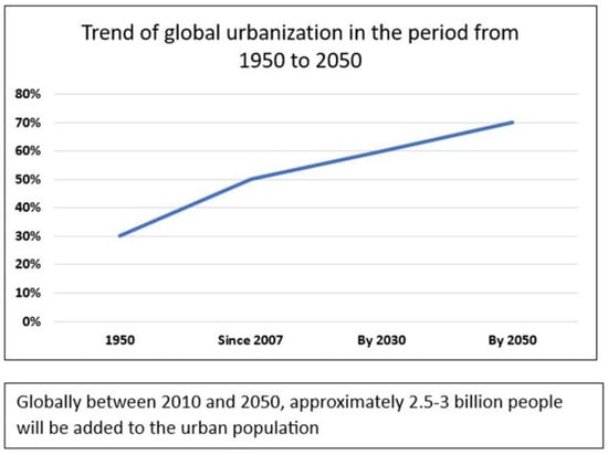 Even though the international frameworks such as the New Urban Agenda, SDG 11, and the Paris Agreement provide a broad guideline, their practicality on the ground depends on the institutional capacity and socio-economic environment. In the example of Saudi Arabia, such attempts are translated into the Vision 2030 programs that are aimed at adaptive governance and local implementation rather than direct imitation of the international models. Today, 55% of the total population lives in cities, and 85% of the gross world product is produced in urban centers, which are viewed as the centers of employment, innovations, and investments [17]. However, urbanization and related issues have led to major environmental issues. A major challenge that cities continue to exhibit is that they generate 75% of greenhouse gases and 70% of world waste through industrial actions and uncontrolled consumption, consequently resulting in environmental deterioration [18] (Figure 1). According to the statistics of the United Nations, by 2050, 75% of people will live in cities, of which 18% will live in the 40 largest urbanized areas, which will contribute to 60% of all economic activity and 85% of technological advances, as shown in Figure 2 [19].