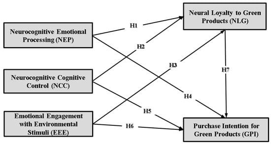 In addition to the direct relationships illustrated in Figure 1, the conceptual model integrates hypotheses H8–H10, which analyze the role of neural loyalty (NLG) as an intermediary mechanism between emotional and cognitive processes (NEP, NCC, EEE) and green product purchase intention (GPI). Hypotheses H8–H10 indicate that the influence of the NEP, NCC, and EEE variables on GPI is not limited to a direct impact but is partly transmitted through the strengthening of neural loyalty, which converts affective and rational reactions into consistent and predictable purchasing behaviors.
