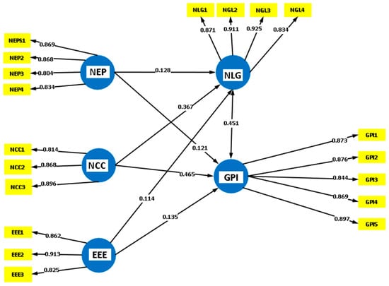 Proposed research model. Note: H8–H10 represent the mediation hypotheses tested through the indirect effects between the independent variables (NEP, NCC, EEE) and GPI, with NLG as mediator.