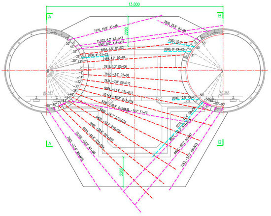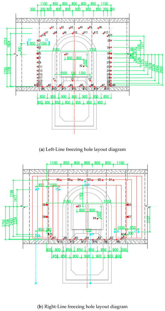Serving a dual purpose as both a pump room and a cross passage, the No. 2 structure adopts a bilateral tunnel arrangement for simultaneous drilling, with 78 freezing holes strategically distributed across the up-line and down-line tunnels. Specifically, 57 holes are positioned along the left tunnel and 21 along the right, resulting in a total drilling length of approximately 660.46 m. Moreover, four additional rows of freezing pipes are installed in the upper section of the adjacent tunnel to establish an auxiliary thermal insulation zone aimed at minimizing heat dissipation.