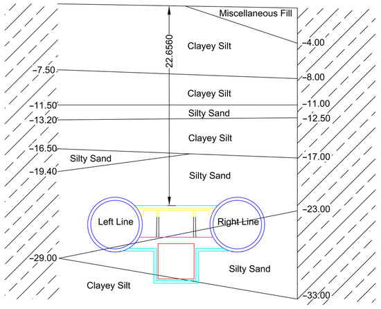 As a national central city and the core of the Central Plains urban cluster, Zhengzhou’s overall urban scale and population continue to expand, leading to increasing traffic pressure. Vigorous development of underground transportation can effectively divert surface traffic flow, serving as a vital supplement to urban transportation. The construction of underground transportation systems can also guide the rational distribution of urban populations and industries toward underground spaces and surrounding areas, optimize the city’s spatial structure, and promote balanced urban development [1]. The subway system, as the backbone of urban underground transportation, relies on the effective operation of a series of key auxiliary structures for its own safety and reliability. Among these, the cross passages connecting adjacent tunnel lines are one such key structure. As an intermediate passage connecting two adjacent subway tunnels, the cross passage not only serves as an escape route during emergencies but also plays a vital role in maintaining subway support structures and drainage systems. This study selects the No. 2 cross passage of Zhengzhou Metro Line 8 as a case for in-depth analysis. The connecting passage is buried at a depth of 22.656 m and is located in a sand layer with high water content, which poses significant challenges to conventional construction methods. In response to this water-rich sand layer, the artificial freezing method has become the optimal solution for the construction of this project due to its high safety and good waterproof performance [2,3].