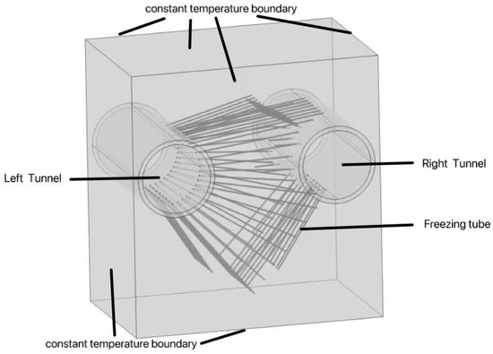Using the built-in model module of COMSOL for modeling, a transient study of the water–heat coupling in the entire area is conducted. The dimensions of the entire model are length × width × height = 20 m × 13 m × 21 m, consisting of three main components: left and right tunnels, 74 freezing pipes, and the soil. The specific shape of the model and the model’s boundary conditions are depicted in Figure 5.