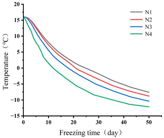 (2) For grid partitioning, four methods—N1, N2, N3 and N4 (representing four different grid precisions: more refined, refined, standard, and coarse). Through numerical simulation calculations, the temperatures at the C8-2 (Temperature measurement hole C8, depth 1.2 m) measurement point after 50 days of freezing were compared. The temperature variations are shown in Figure 6. The temperatures recorded after 50 days of freezing under the four scenarios were −7.59 °C, −8.77 °C, −10.37 °C and −12.13 °C, respectively. The temperature variation between N2 and N1 was 13.4%, while the variation between N2 and N3 was 18.2%. This demonstrates that when the grid refinement exceeds N2, the model’s calculations become independent of the grid. Therefore, all subsequent computations were based on the N2.