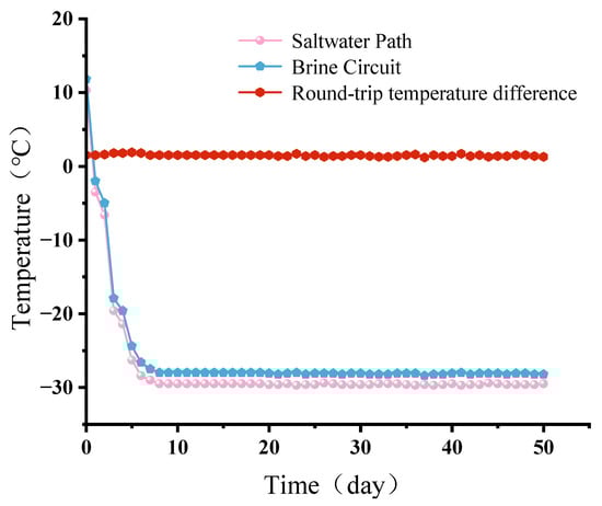 Currently, the commonly used refrigerants in the freezing method are primarily low-temperature brine and liquid nitrogen. Considering the economic benefits of the project, low-temperature brine is selected as the refrigerant. The essence of the freezing method is to circulate low-temperature brine through the freezing pipes. Due to the higher temperature of the soil, some heat is transferred to the low-temperature brine, causing a continuous reduction in heat in the soil and gradually forming a frozen soil curtain [31,32]. After the initial activation of the freezing system, there is a significant temperature difference between the soil and the low-temperature brine inside the freezing pipes. According to the analysis based on Newton’s law of cooling and Fourier’s law of heat conduction, during this stage, the rate of heat conduction in the soil reaches its peak, exhibiting a rapid cooling trend, while the brine circulation system shows a high heat exchange load state [33]. Throughout the entire phase change heat transfer process of the frozen soil curtain, the thermal gradient of the low-temperature brine circulation system generally exhibits a converging characteristic. Figure 7 illustrates the temperature changes in the low-temperature brine circulation system. Monitoring data indicate that on the seventh day of active freezing construction, the temperature of the refrigerant medium has stabilized at −18 °C, and it reaches the −24 °C threshold by the fifteenth day, with the temperature difference in the low-temperature brine circulation system remaining within 2 °C throughout the freezing process. This temperature control meets the thermal equilibrium requirements for safe excavation.